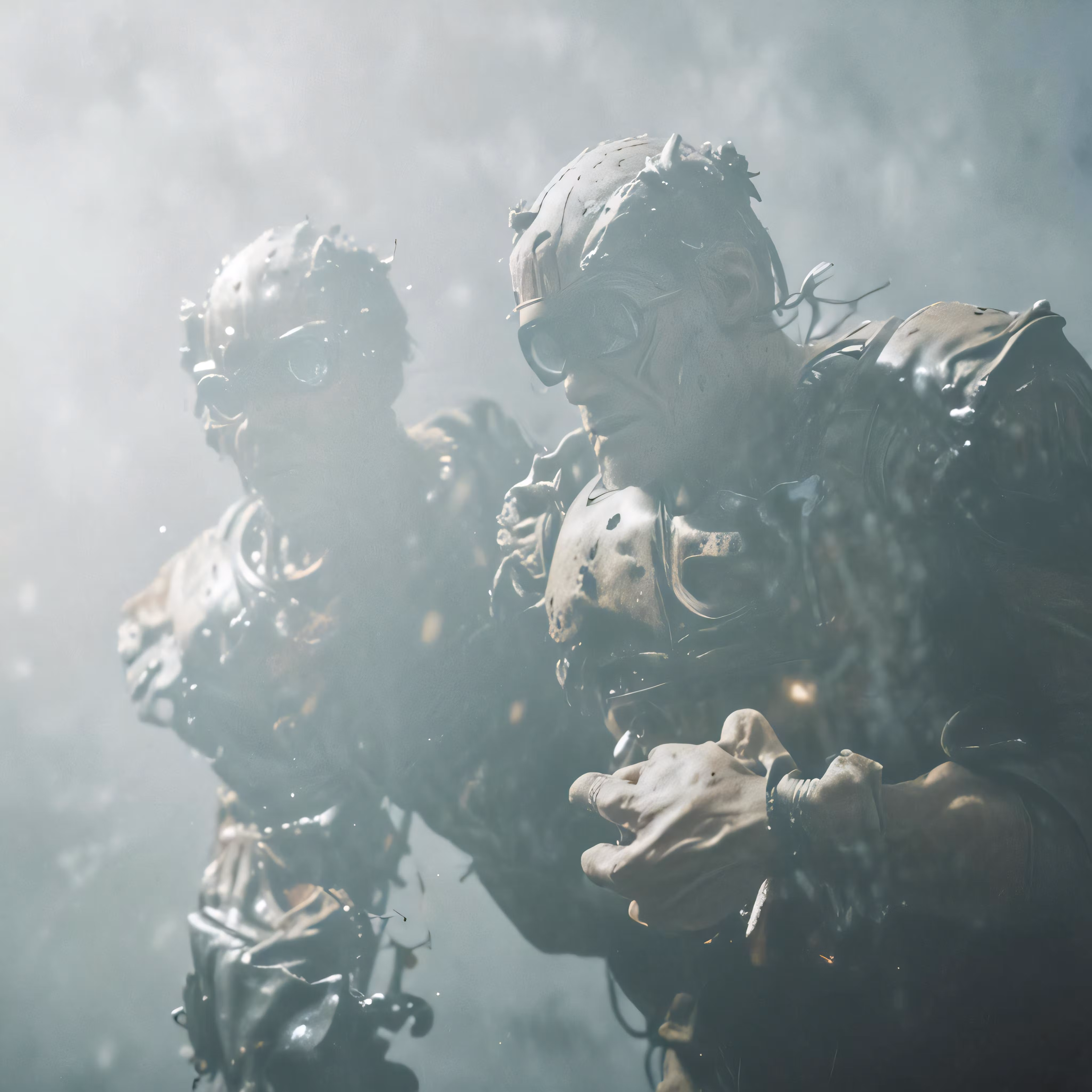 High resolution picture, free to use, an advertisement for a bicycle shop and it says 30 /two men dressed as warfighters in the rain