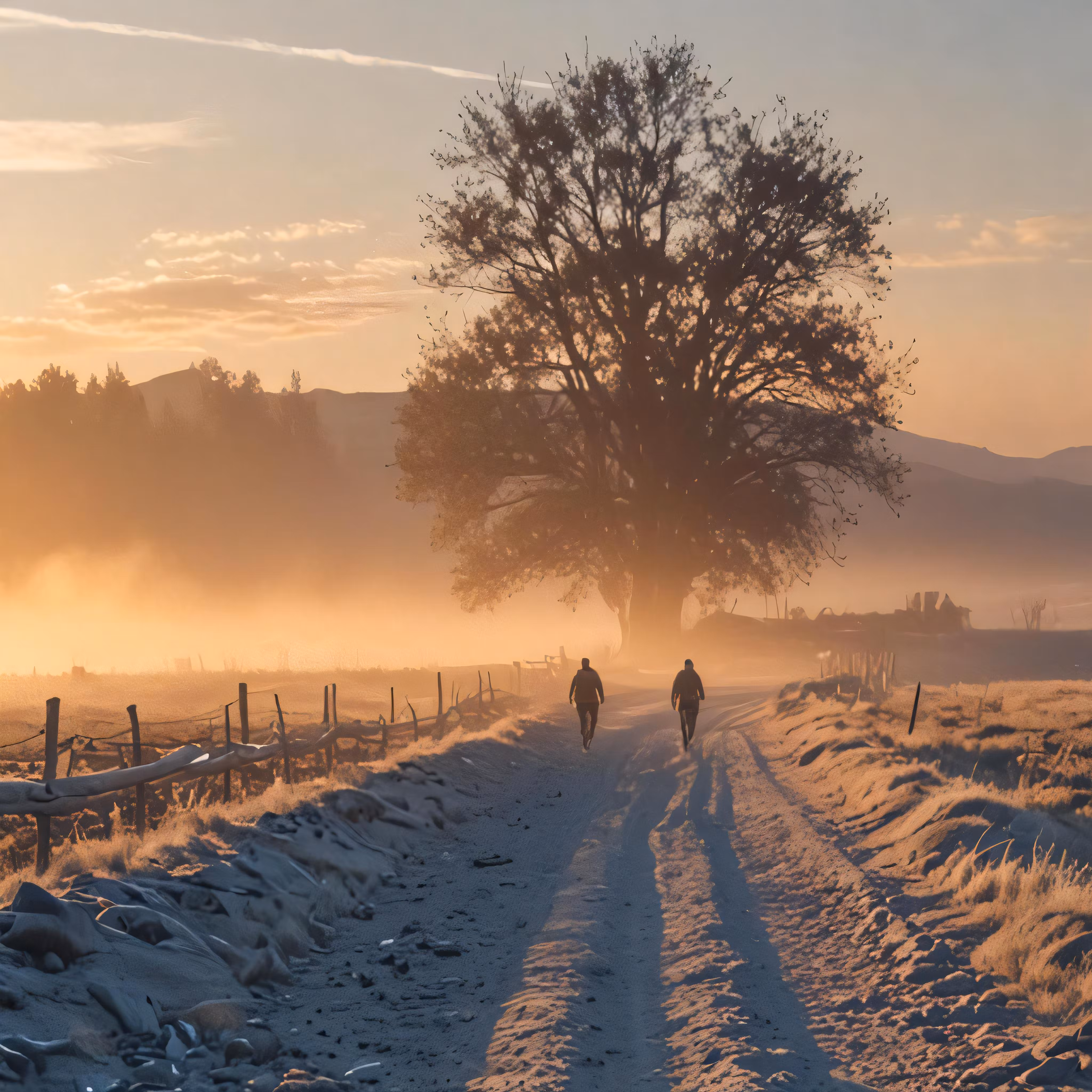 High resolution picture, free to use, an advertisement for a bicycle shop and it says 30 /two people walking down the road under a tree at sunrise