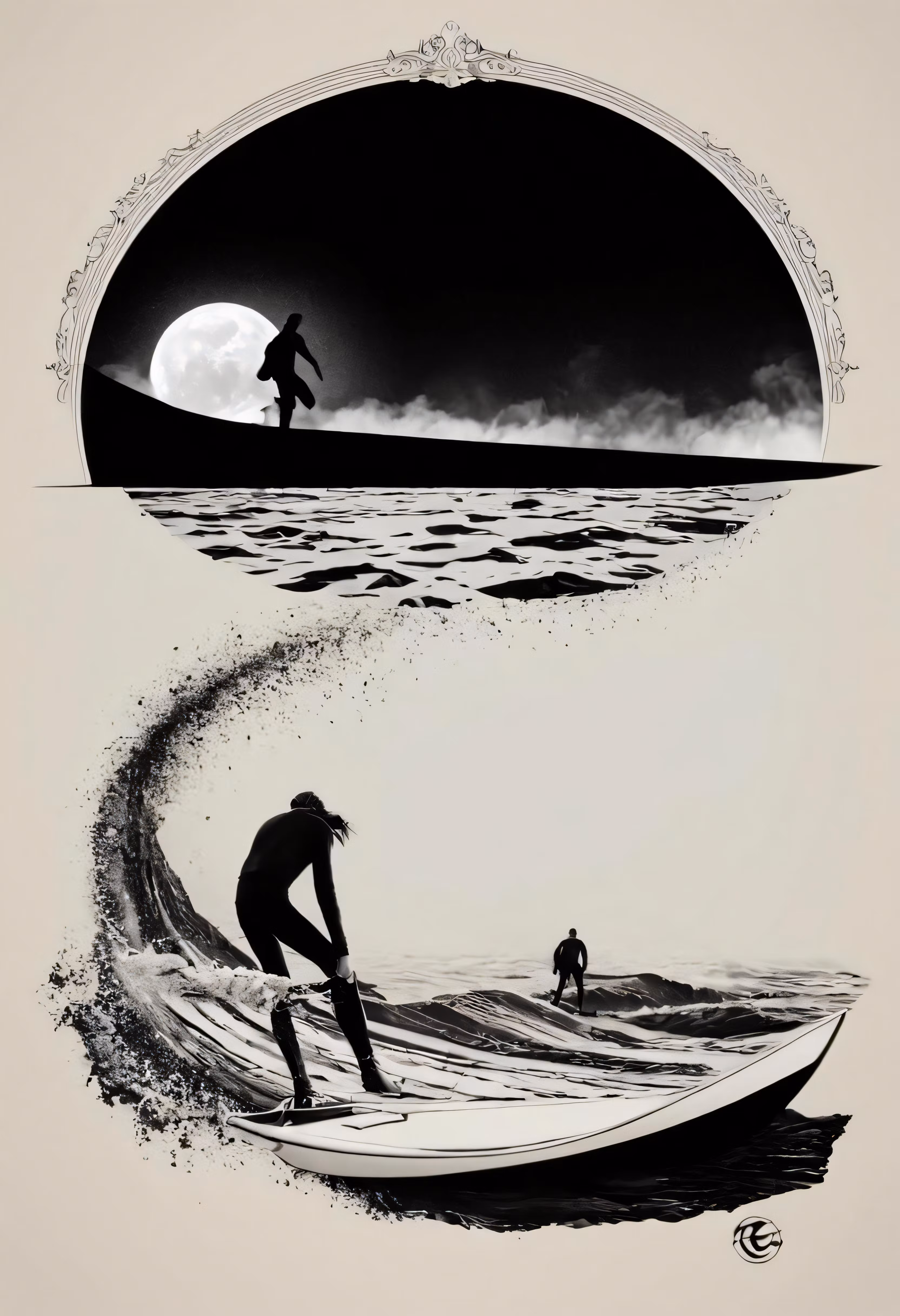 High resolution picture, free to use, an advertisement for a bicycle shop and it says 30 /two pictures of different people riding the waves
