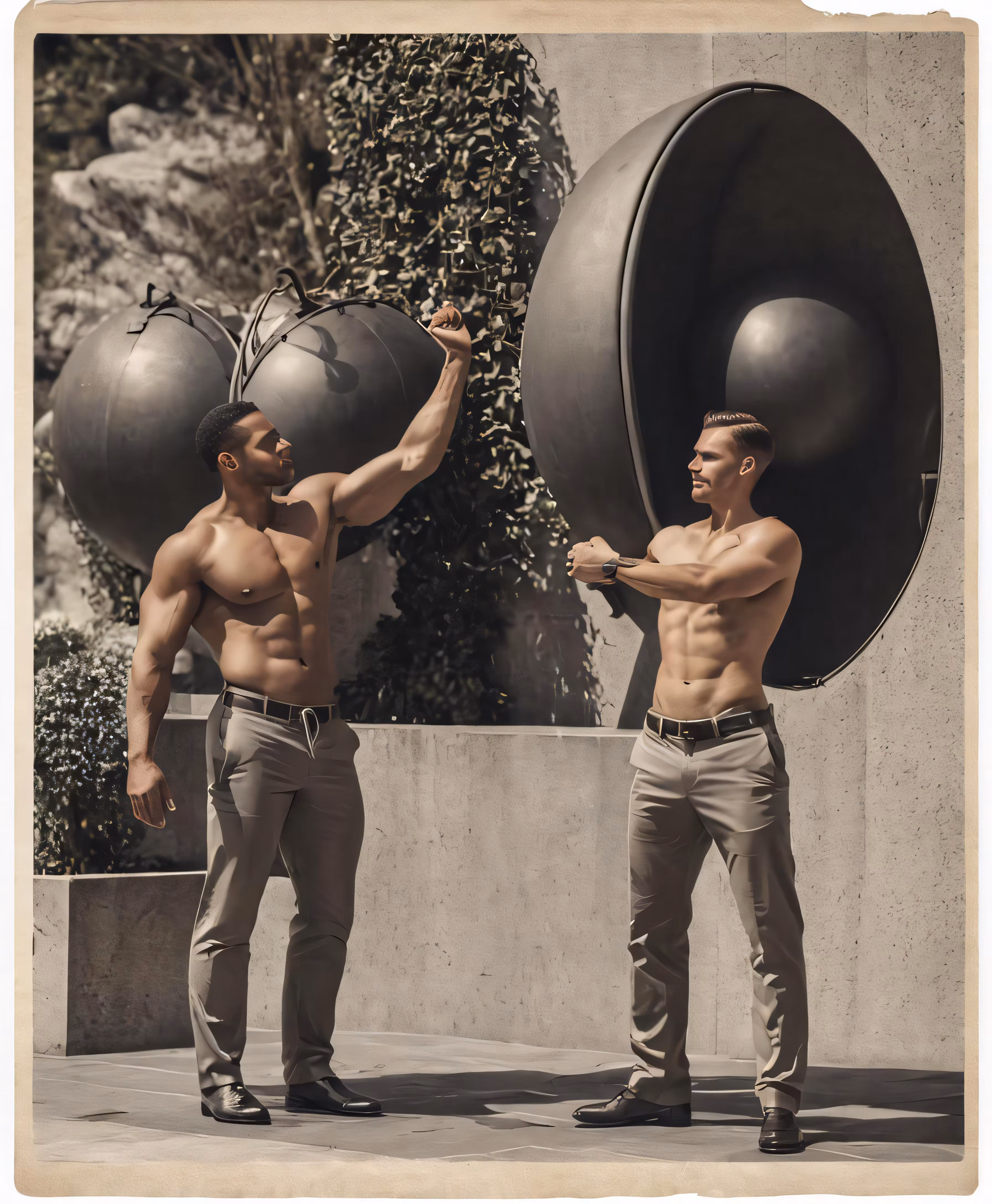 High resolution picture, free to use, an advertisement for a bicycle shop and it says 30 /two shirtless men posing next to each other with large balls on their heads