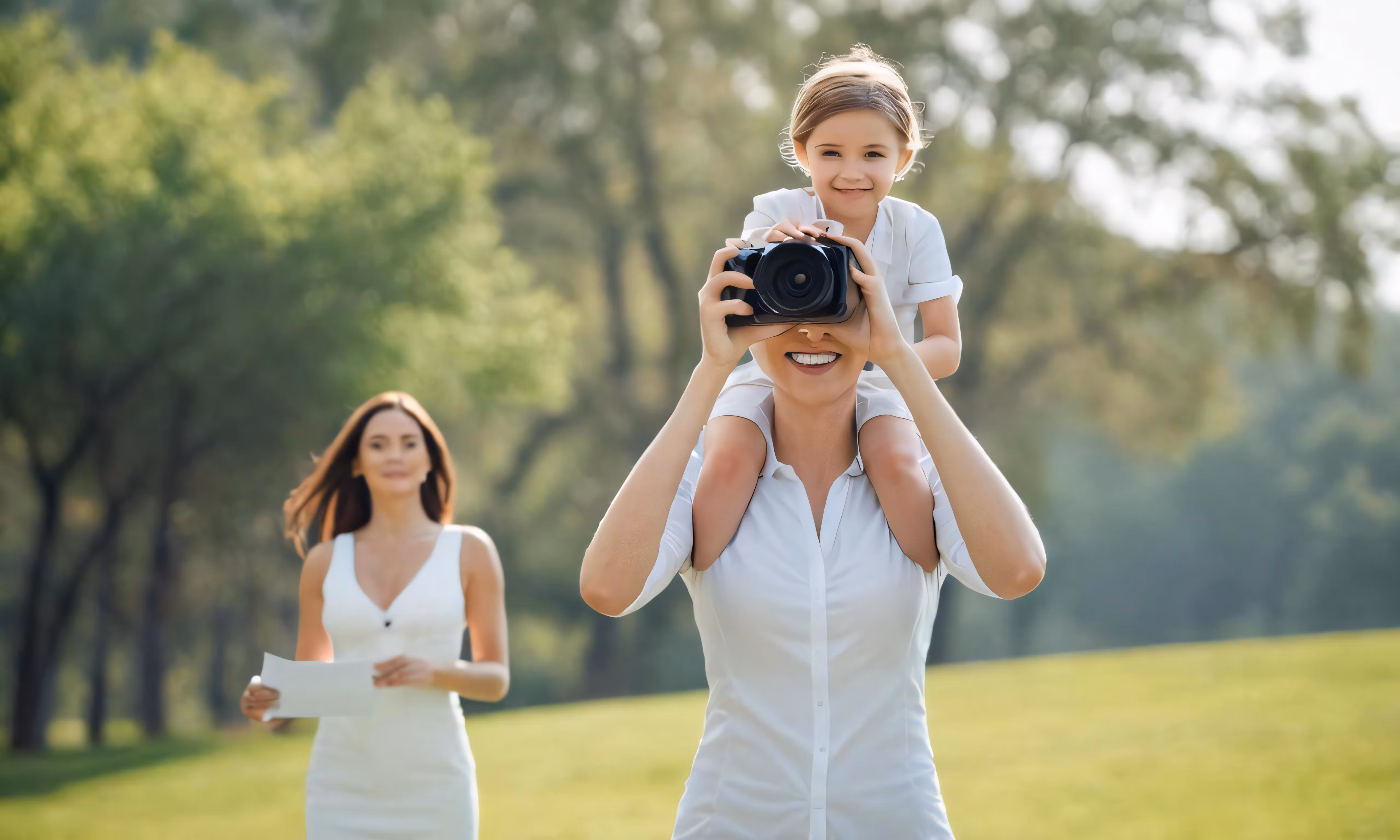 High resolution picture, free to use, an advertisement for a bicycle shop and it says 30 /woman holding up a child while she takes pictures of her and the other girl