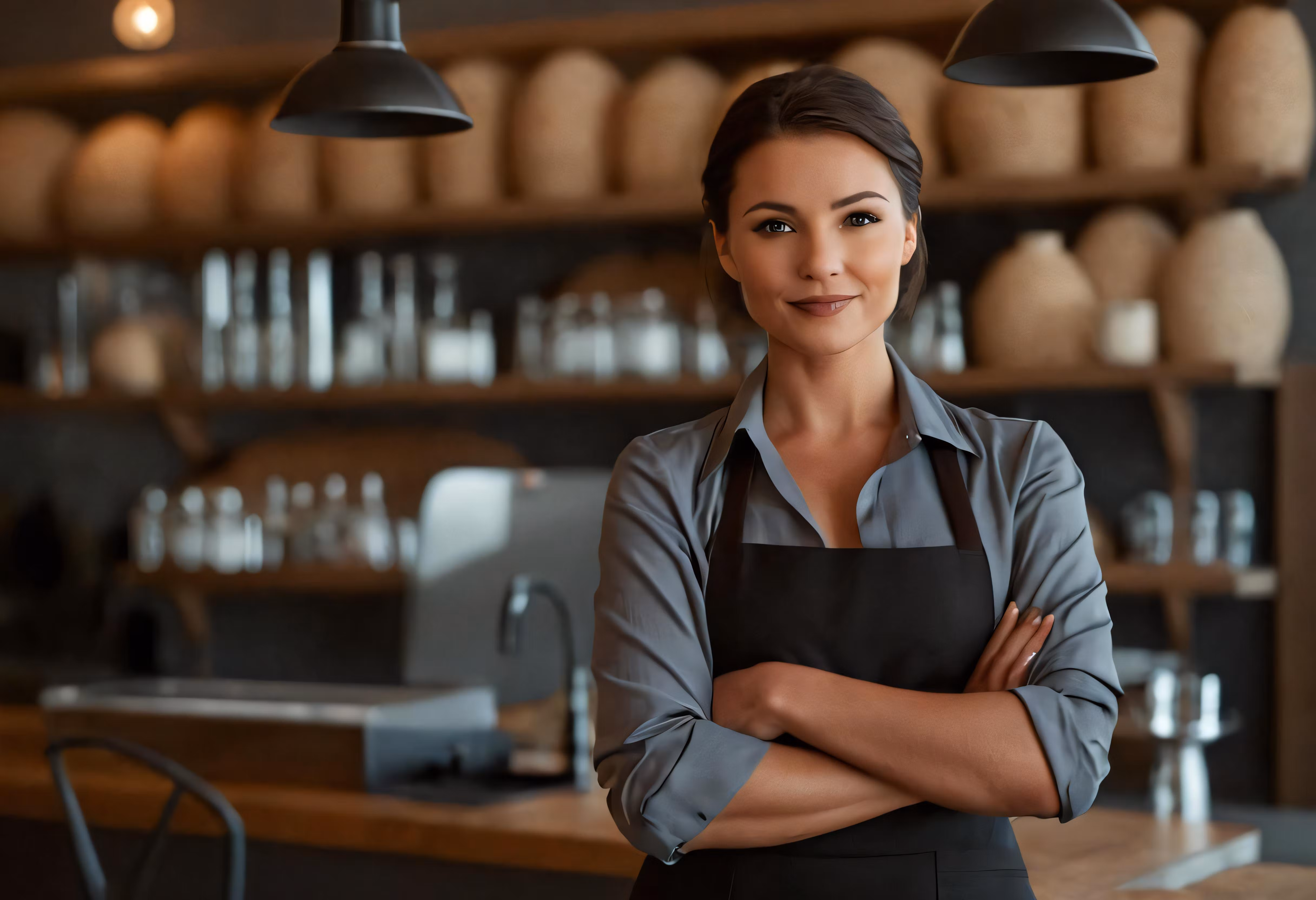 High resolution picture, free to use, an advertisement for a bicycle shop and it says 30 /woman in apron standing in front of a counter and she is holding her arms crossed