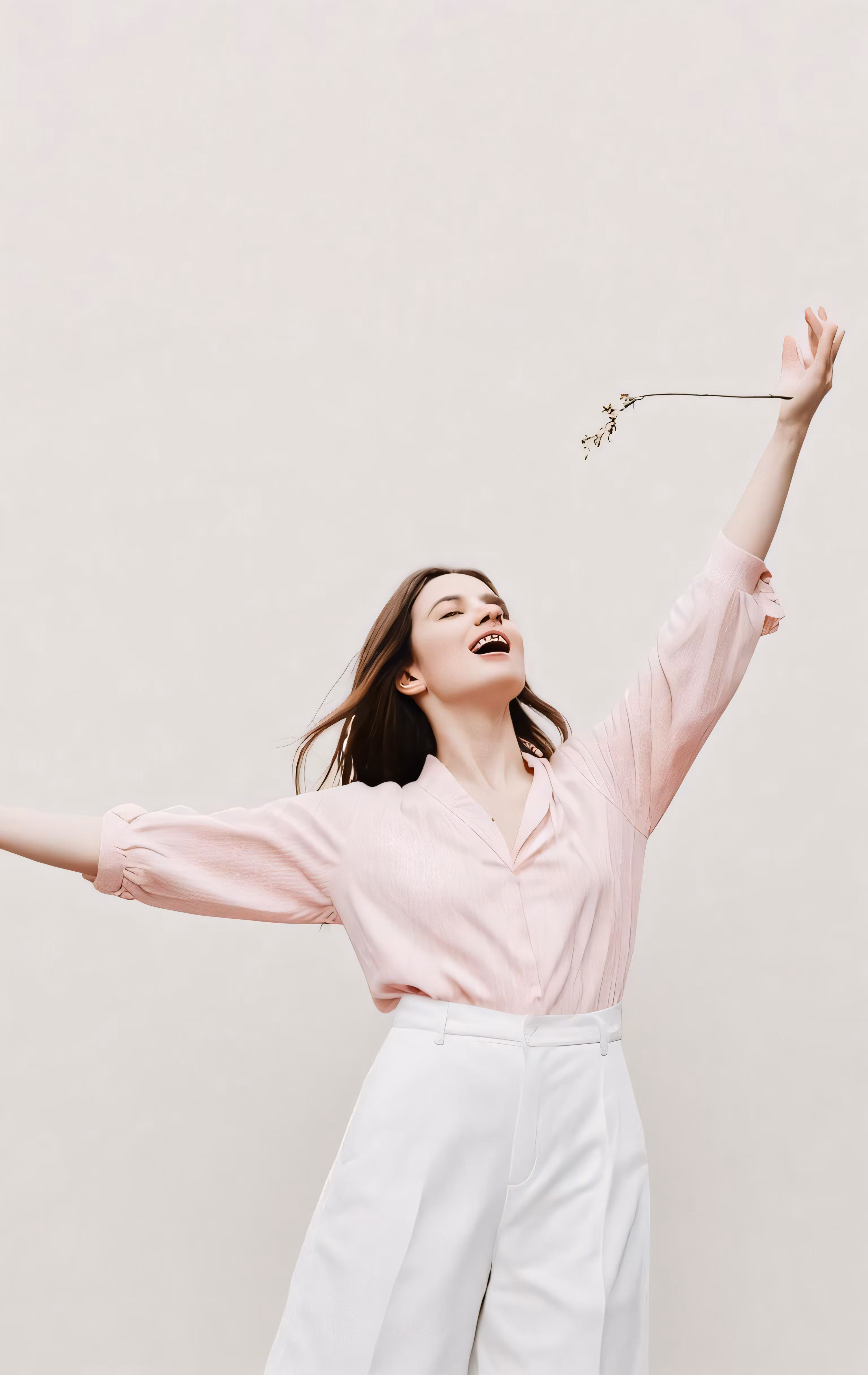 High resolution picture, free to use, an advertisement for a bicycle shop and it says 30 /woman in pink shirt jumping with arms wide open