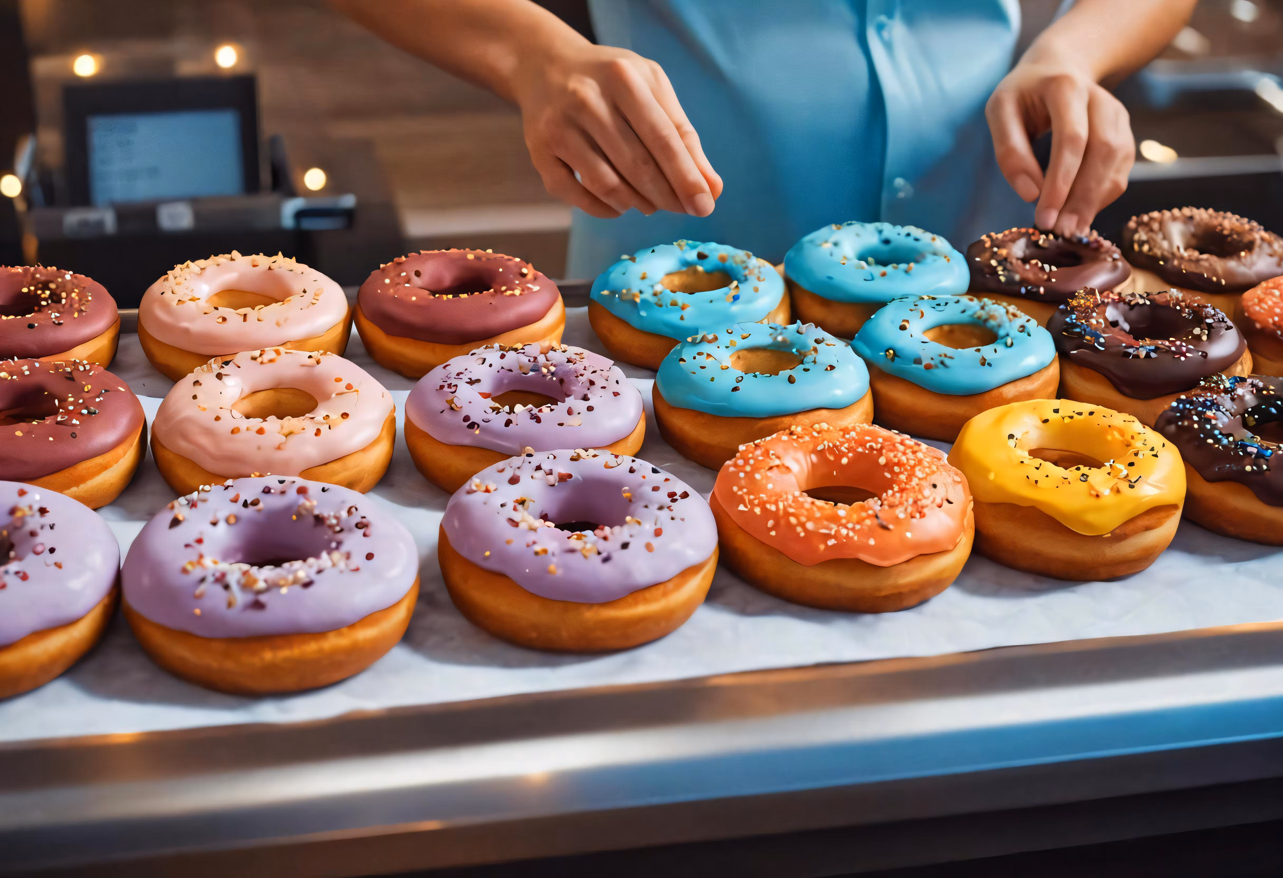 High resolution picture, free to use, an advertisement for a bicycle shop and it says 30 /woman selecting an assortment of donuts from a counter