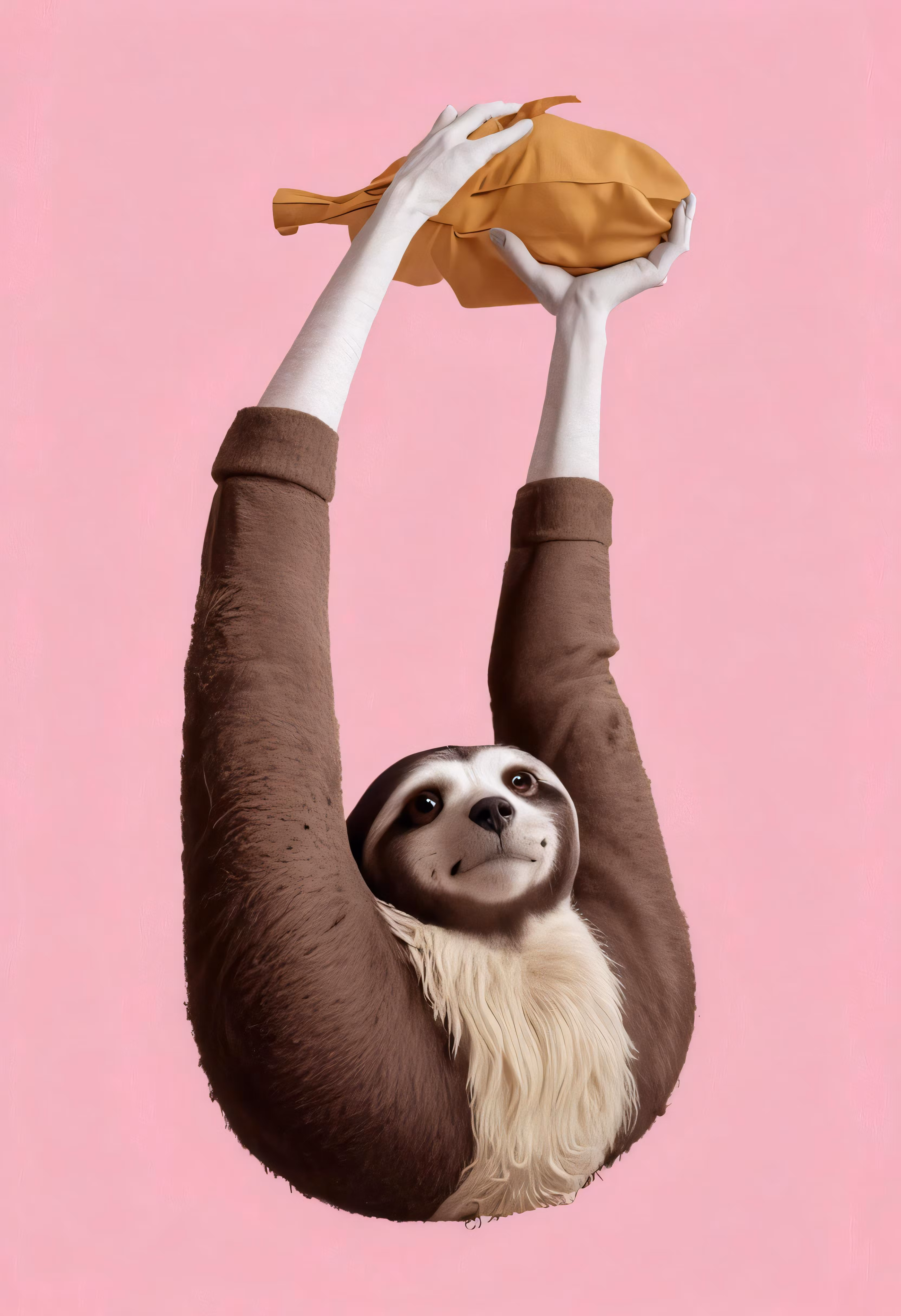 High resolution picture, free to use, an advertisement for a company of cloths showing a slotty bear hanging from a hammock with its head in the air