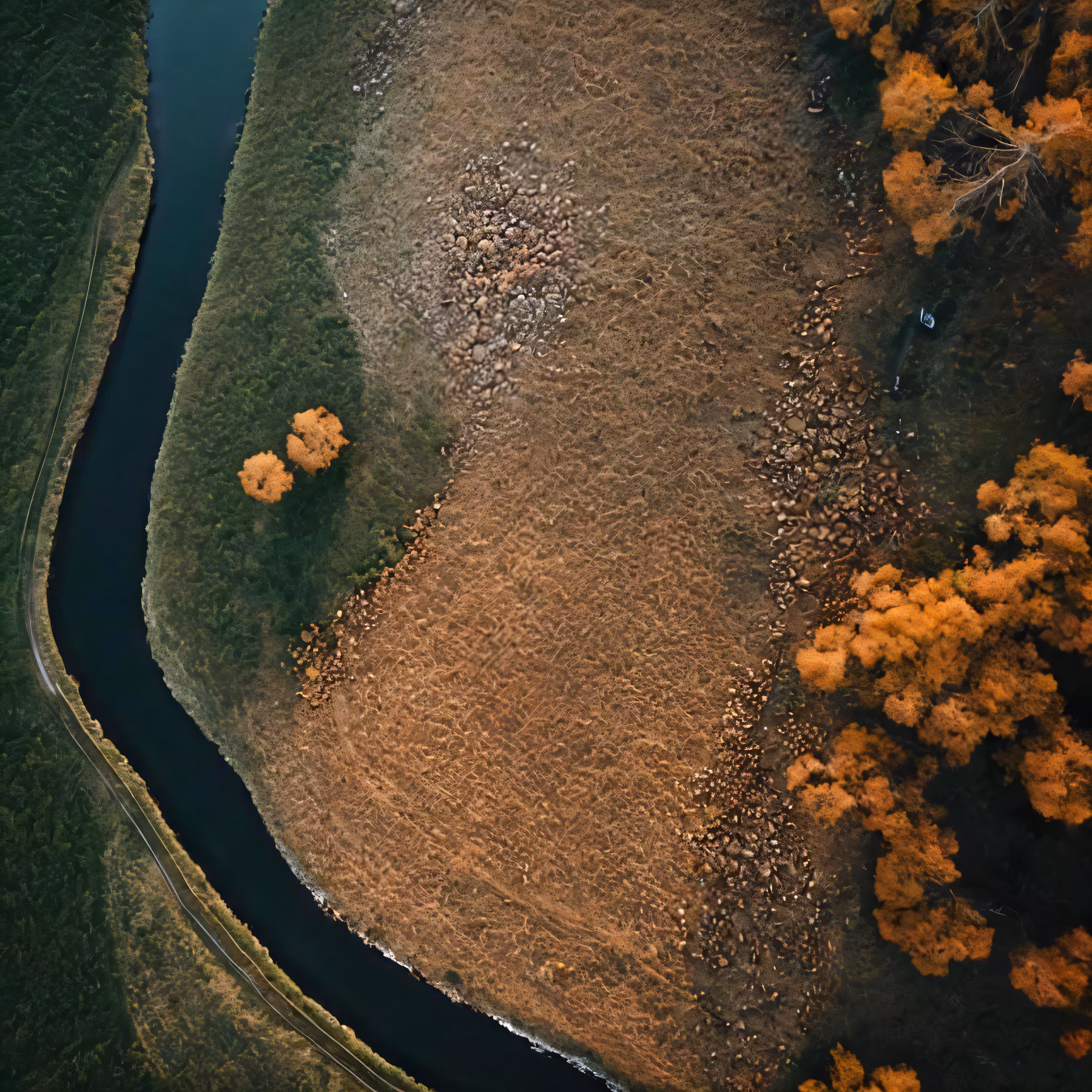 High resolution picture, free to use, an aerial view of a river and brown grass