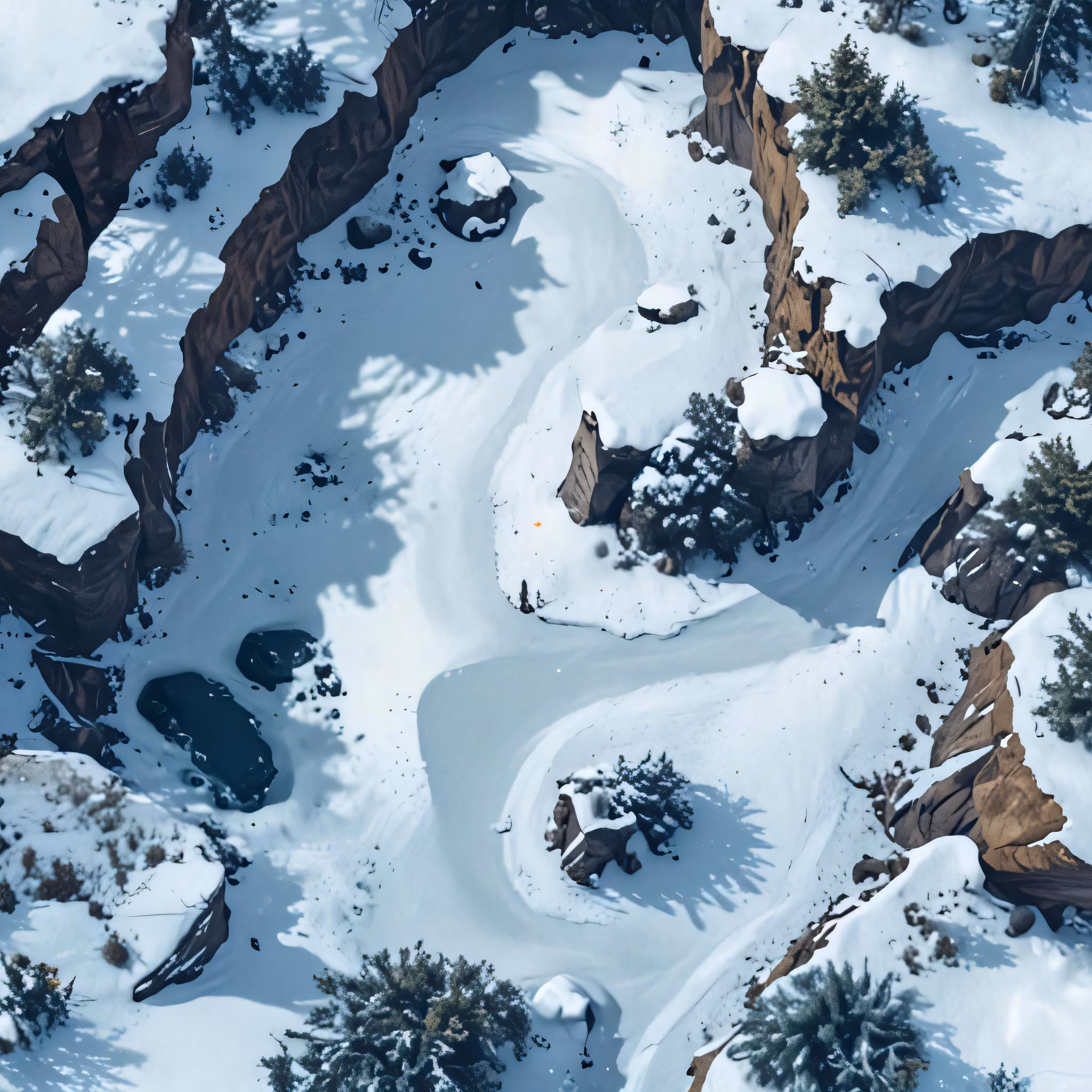 High resolution picture, free to use, an aerial view of some pine trees, river, and snowy hills