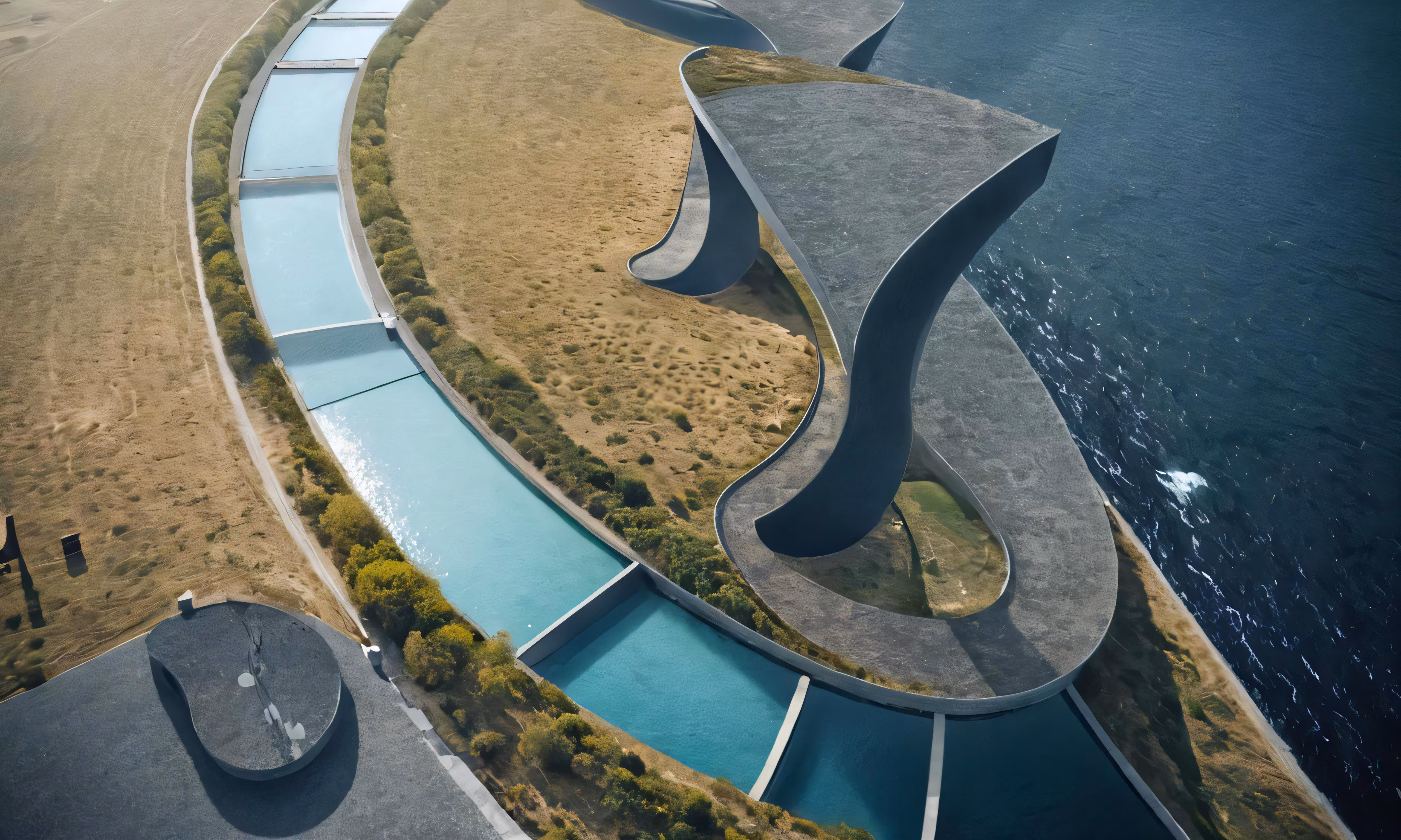 High resolution picture, free to use, an aerial view of the exterior of the curved concrete house with water running from it