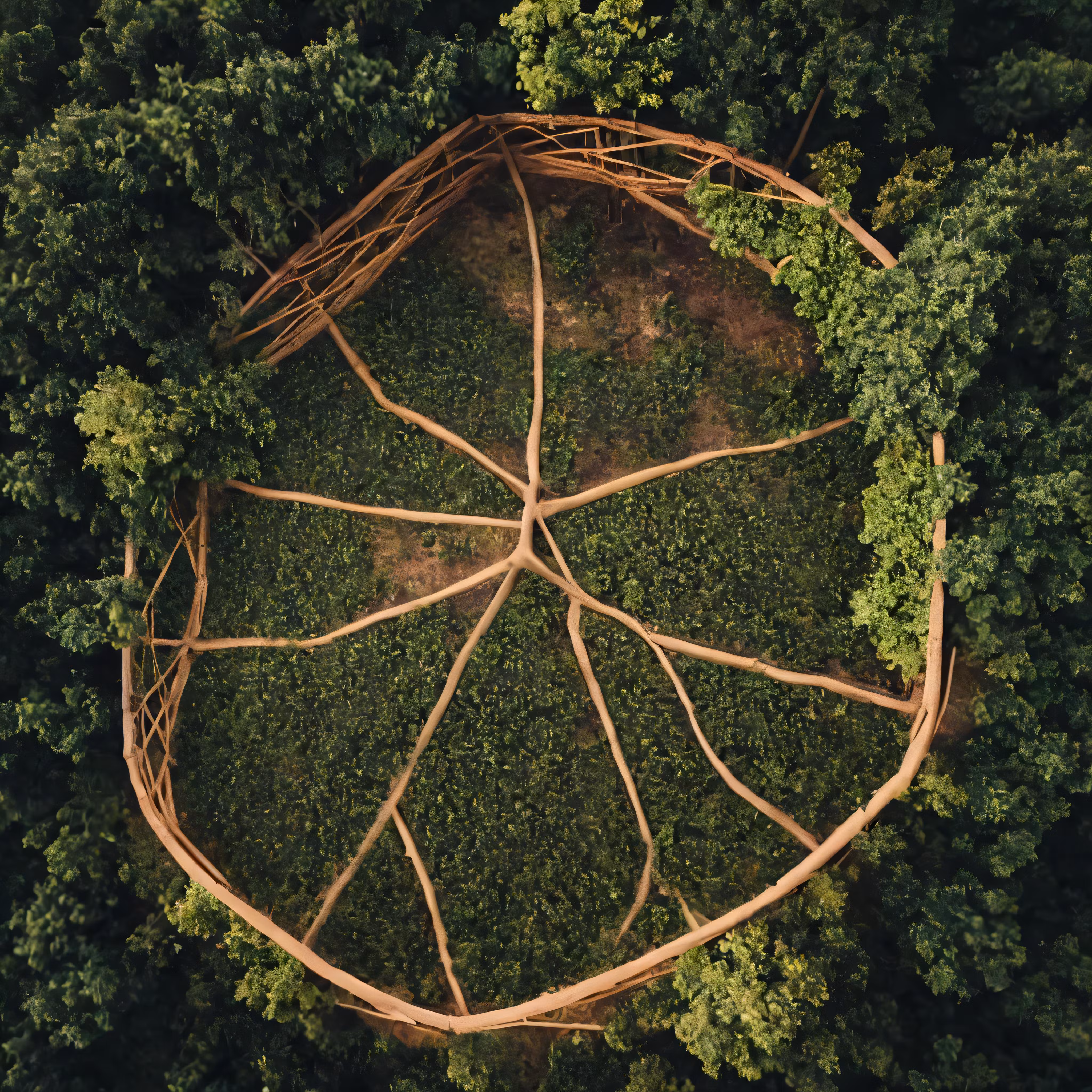 High resolution picture, free to use, an aerial view of the forest showing a circular structure with wood and branches