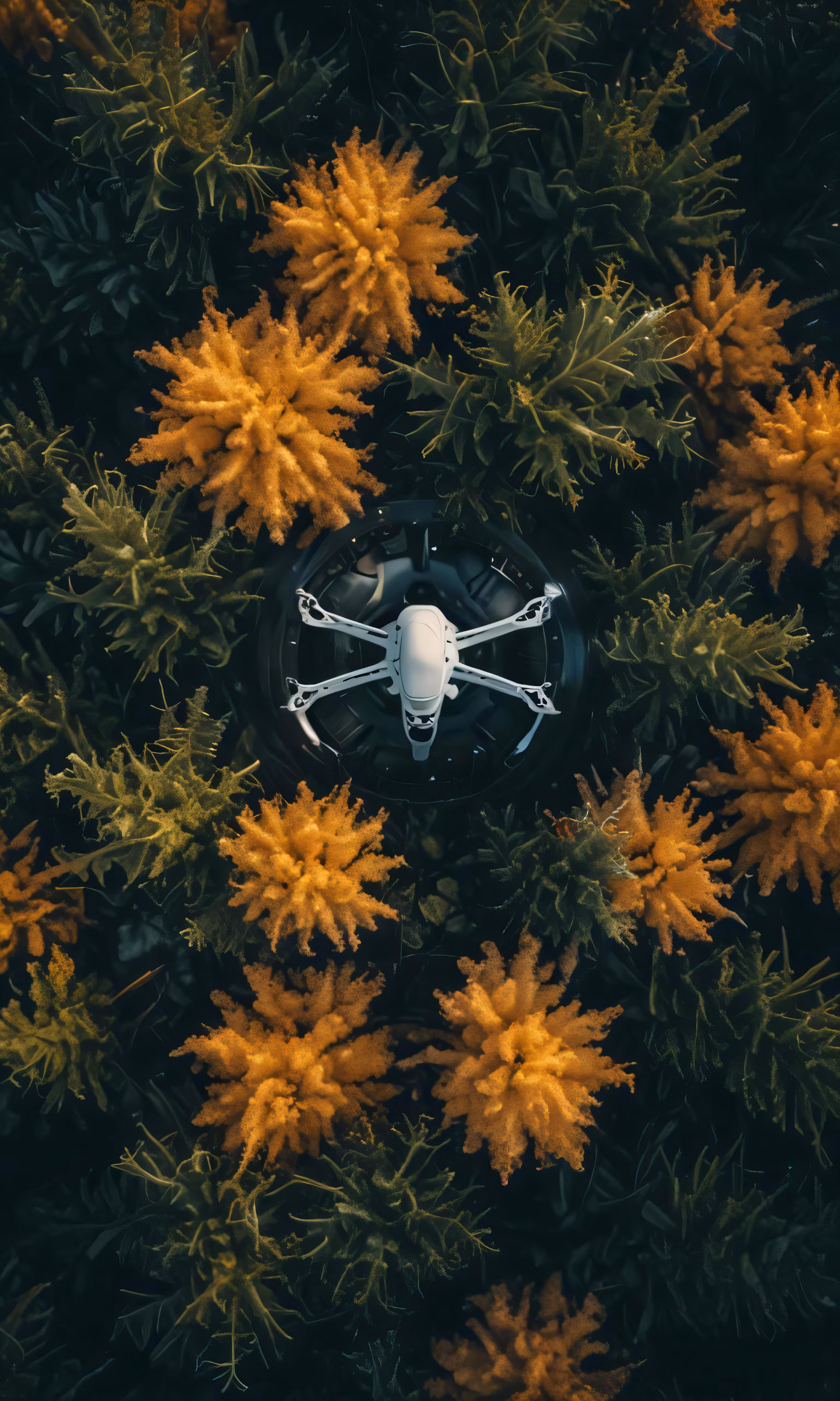 High resolution picture, free to use, an aerial view of the top of a field with orange flowers