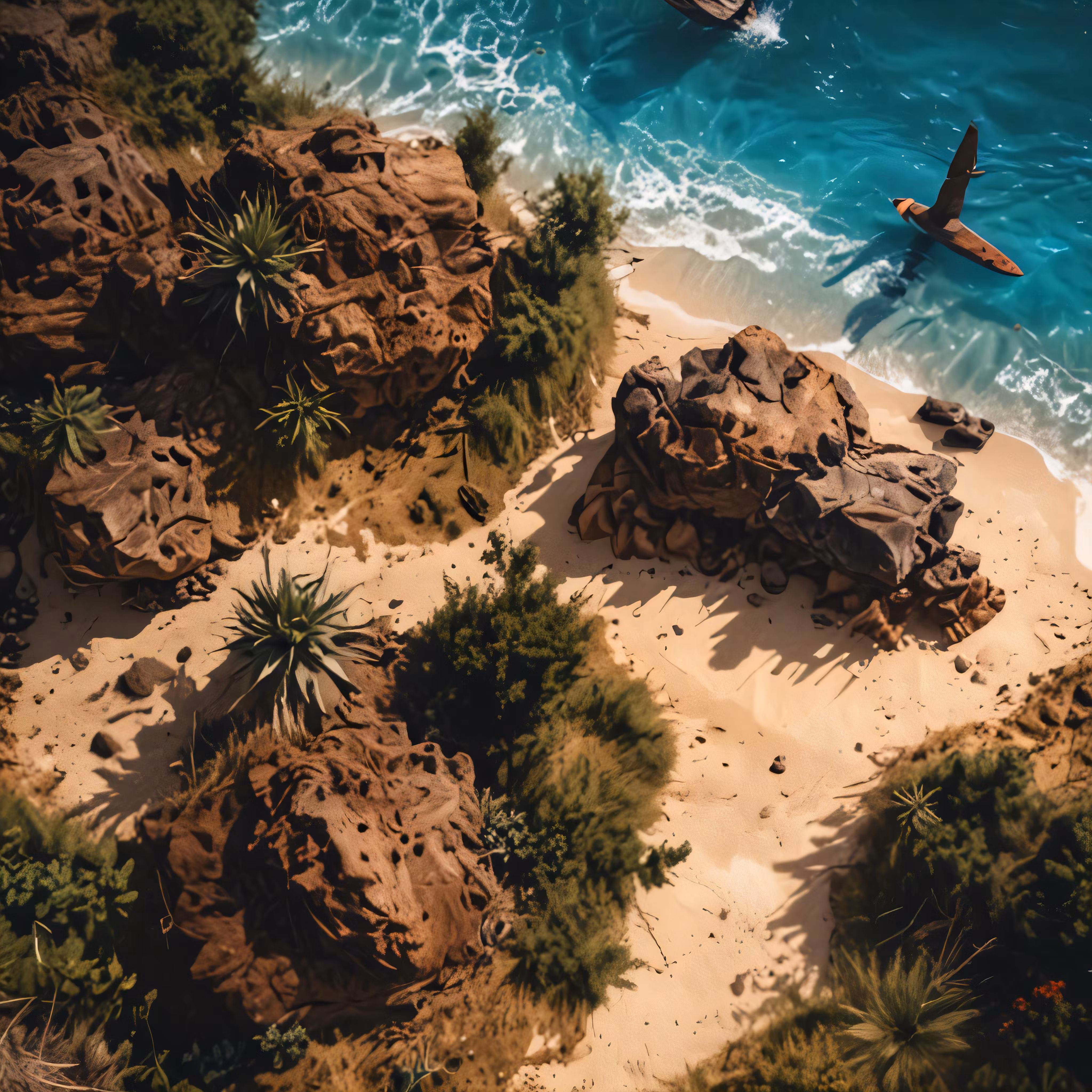 High resolution picture, free to use, an aerial view of two people in the water on a surf board near the beach