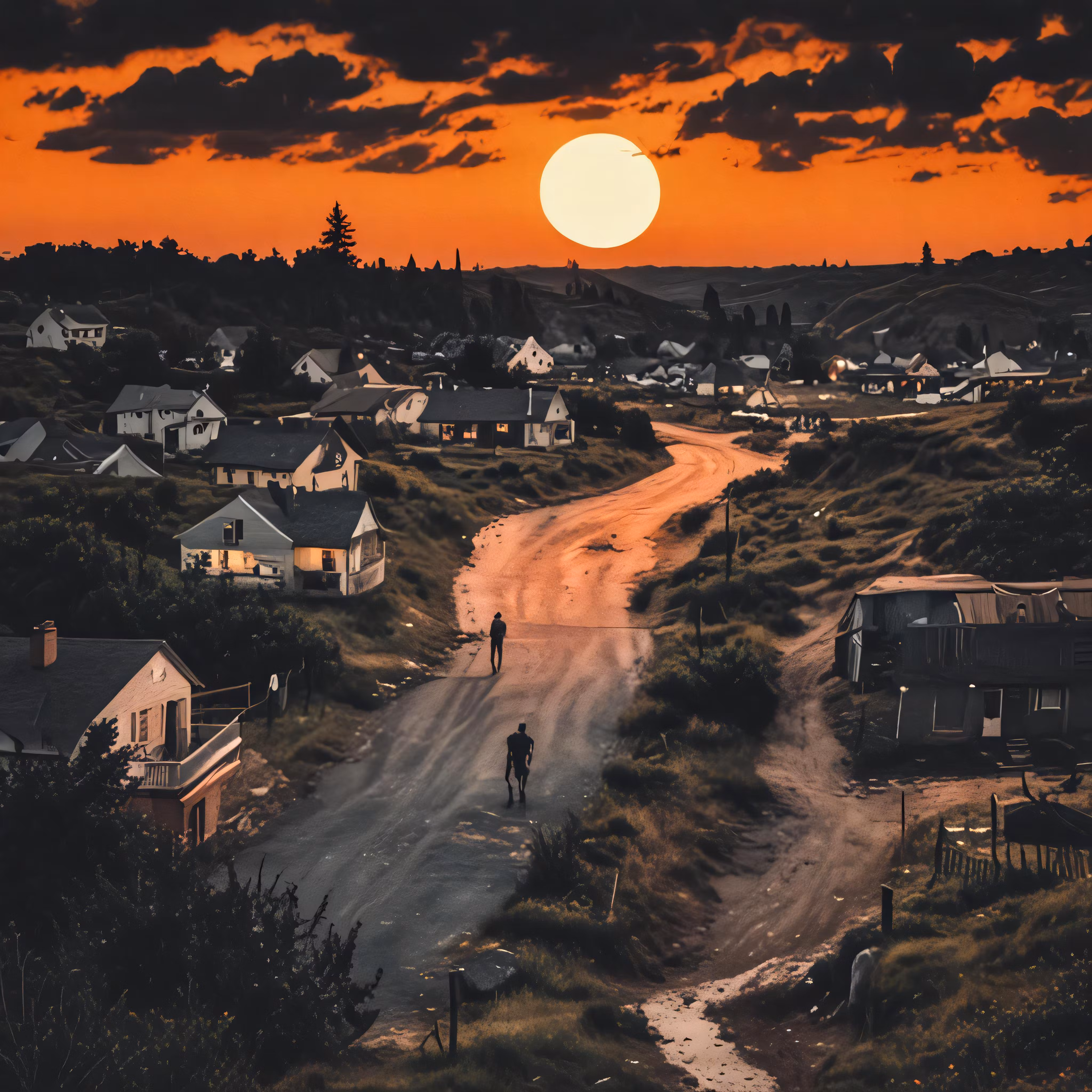 High resolution picture, free to use, an aerial view shows houses, dirt road, and the setting sun