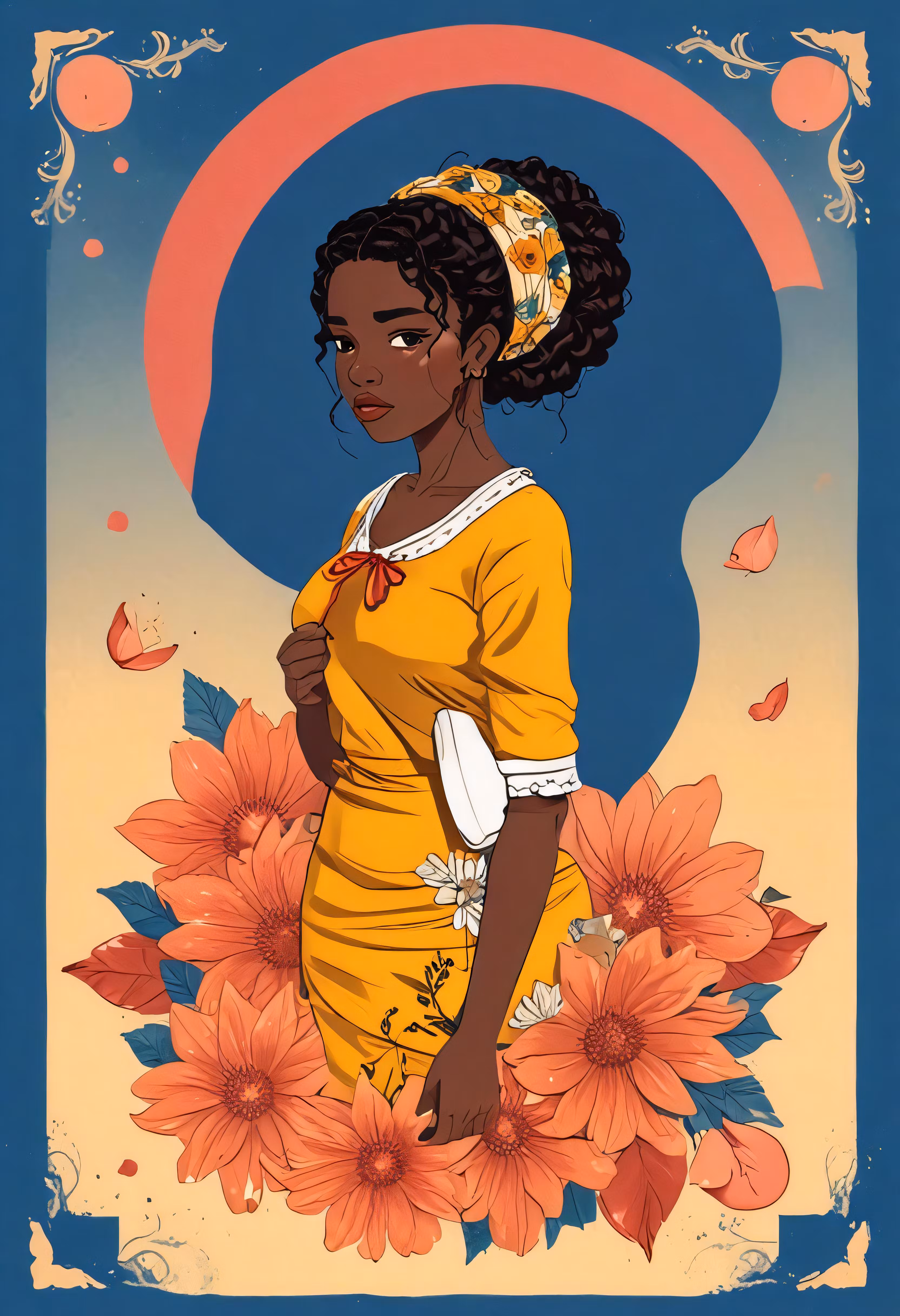 High resolution picture, free to use, an african american woman standing in front of flowers