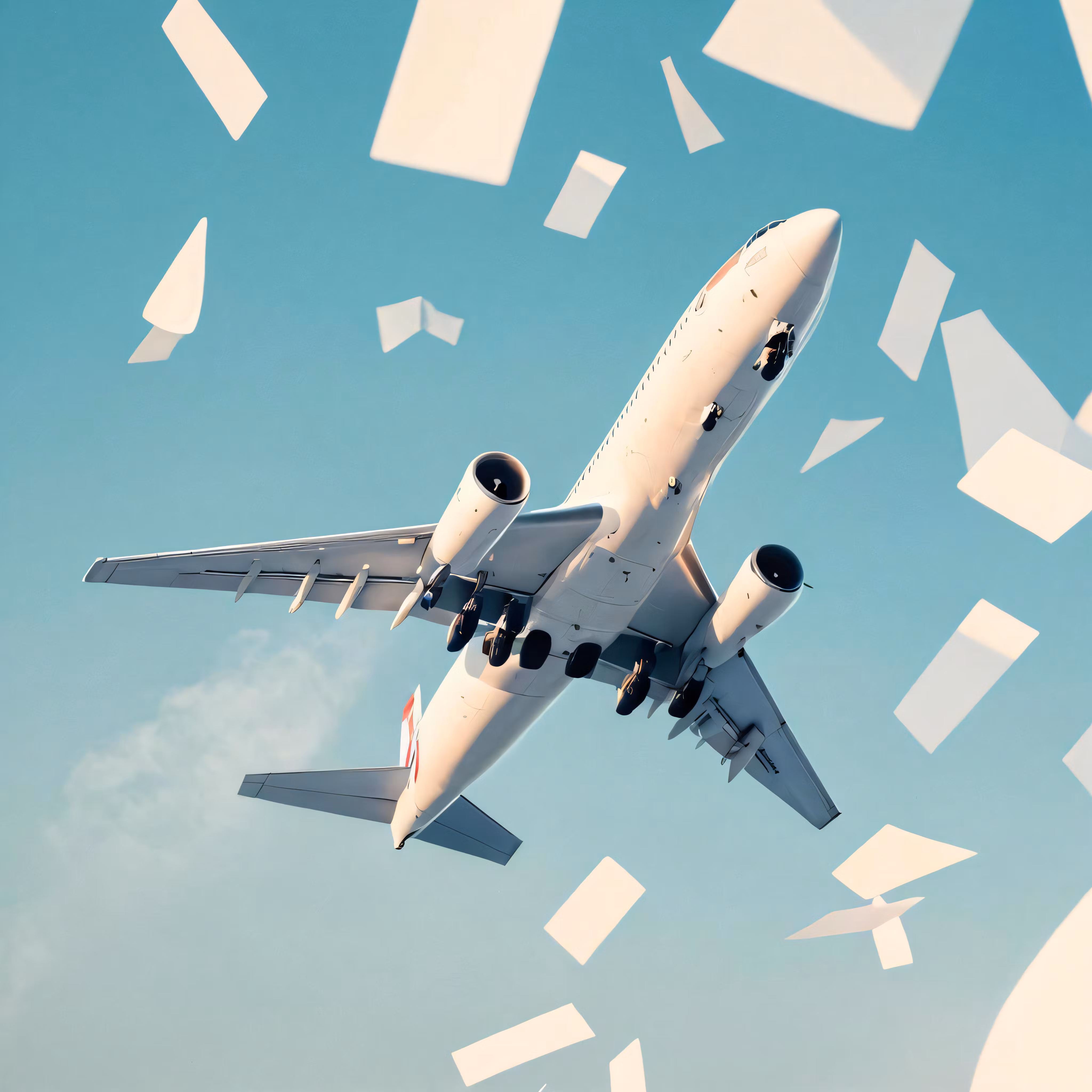 High resolution picture, free to use, an airplane flying through blue skies, with lots of white papers everywhere