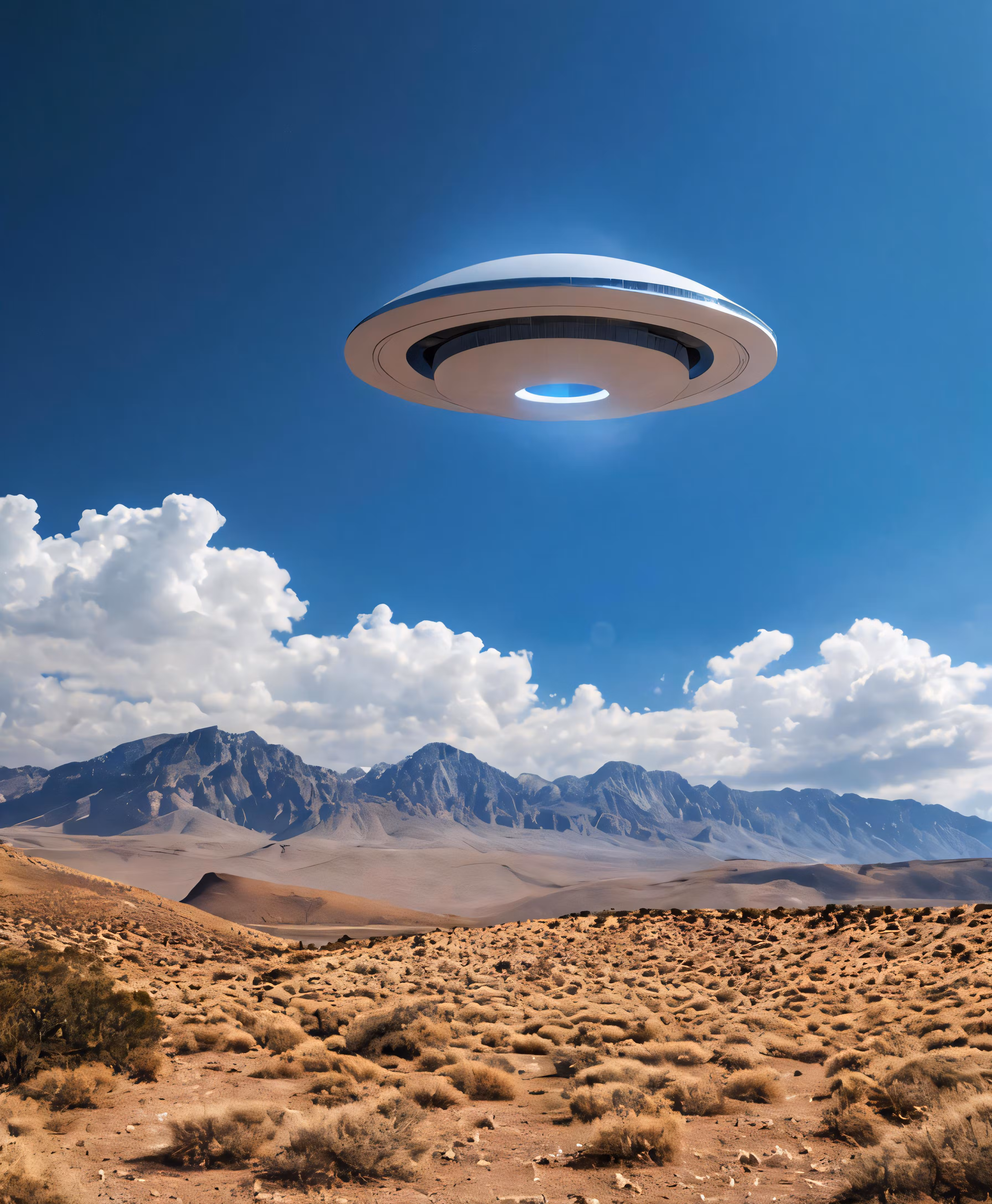 High resolution picture, free to use, an alien flies through the air in front of mountains