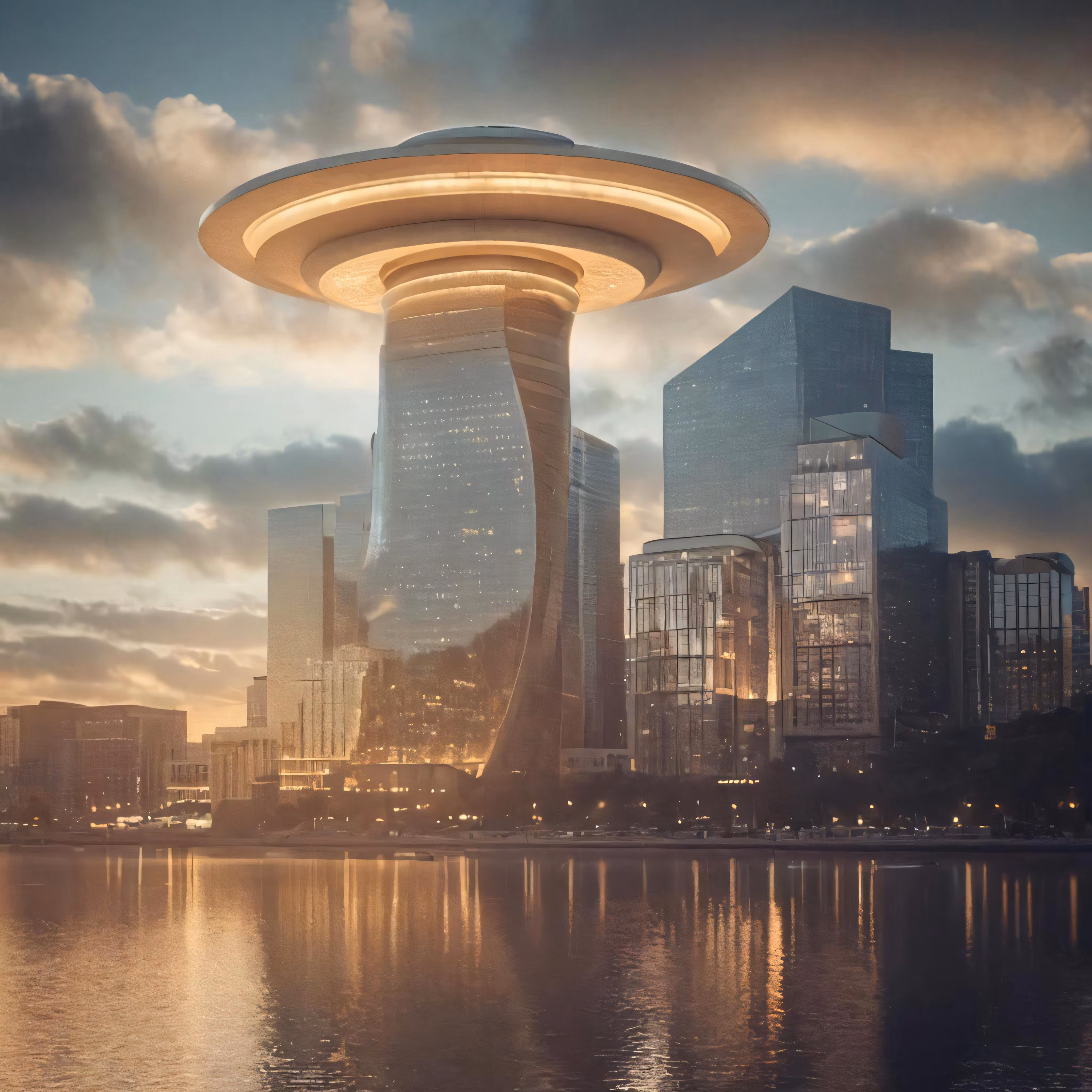 High resolution picture, free to use, an alien like building in the middle of a body of water
