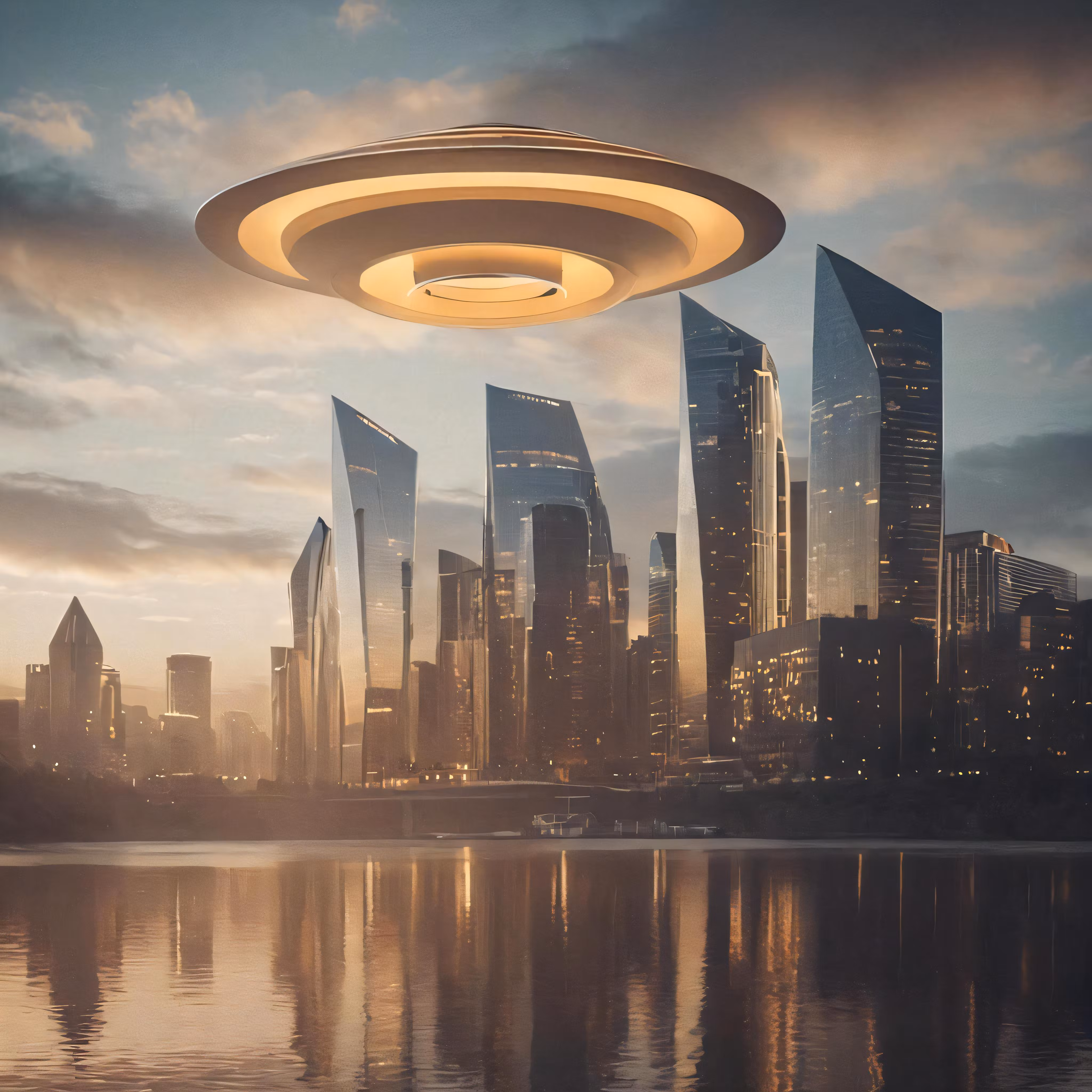 High resolution picture, free to use, an alien spaceship flying over a large city