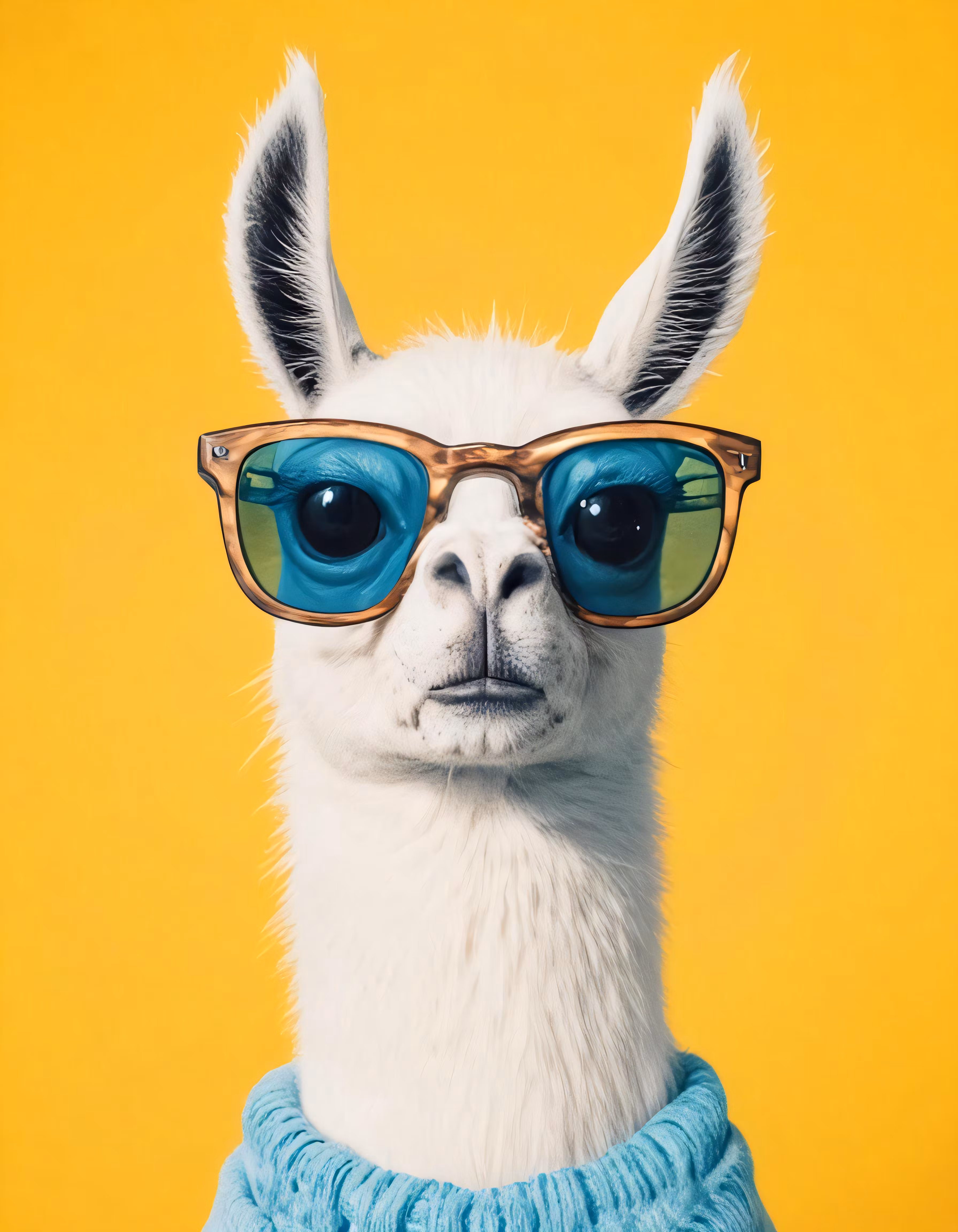 High resolution picture, free to use, an alpaca wearing sunglasses and a sweater