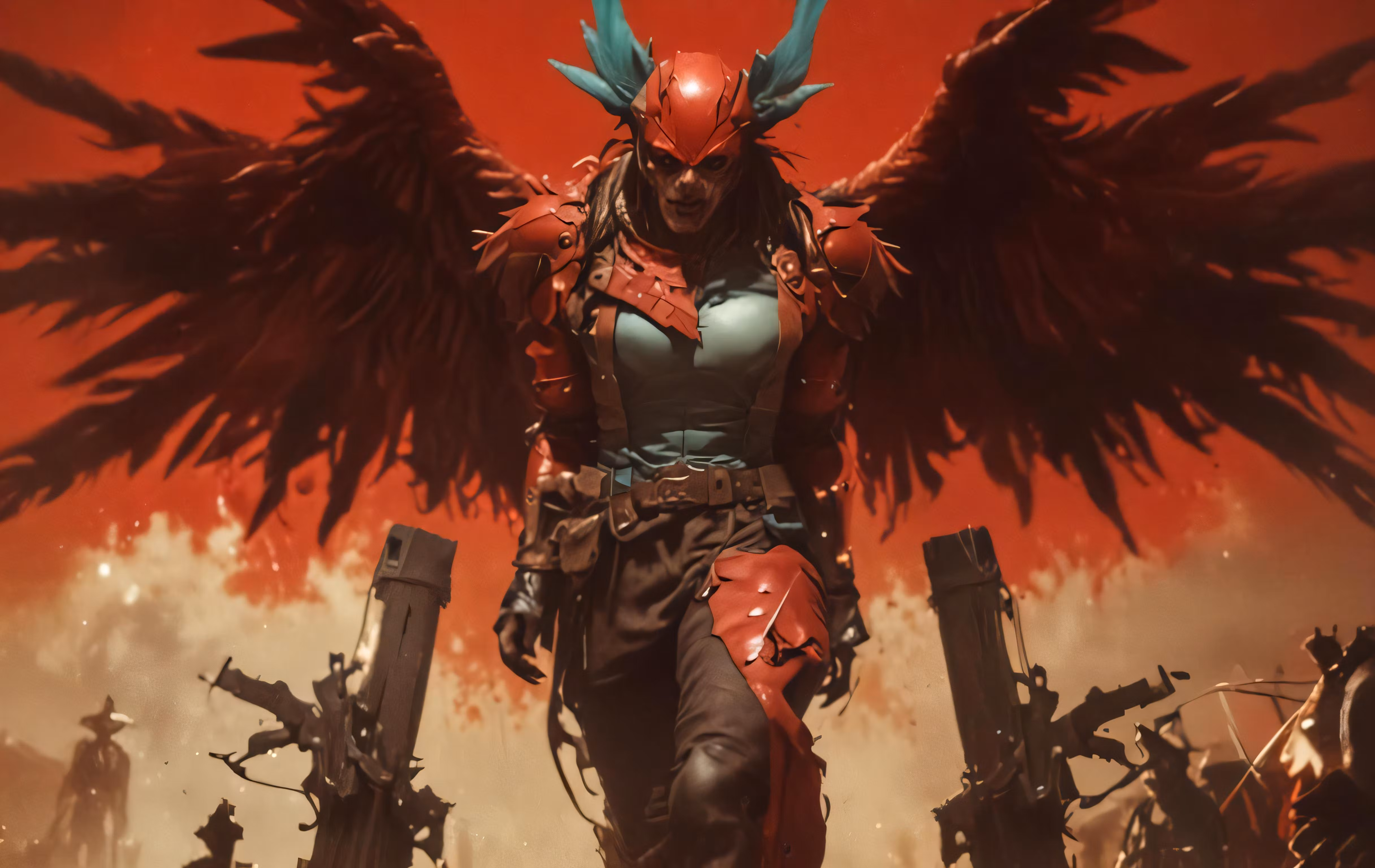 High resolution picture, free to use, an angel with wings stands in the middle of a destroyed city