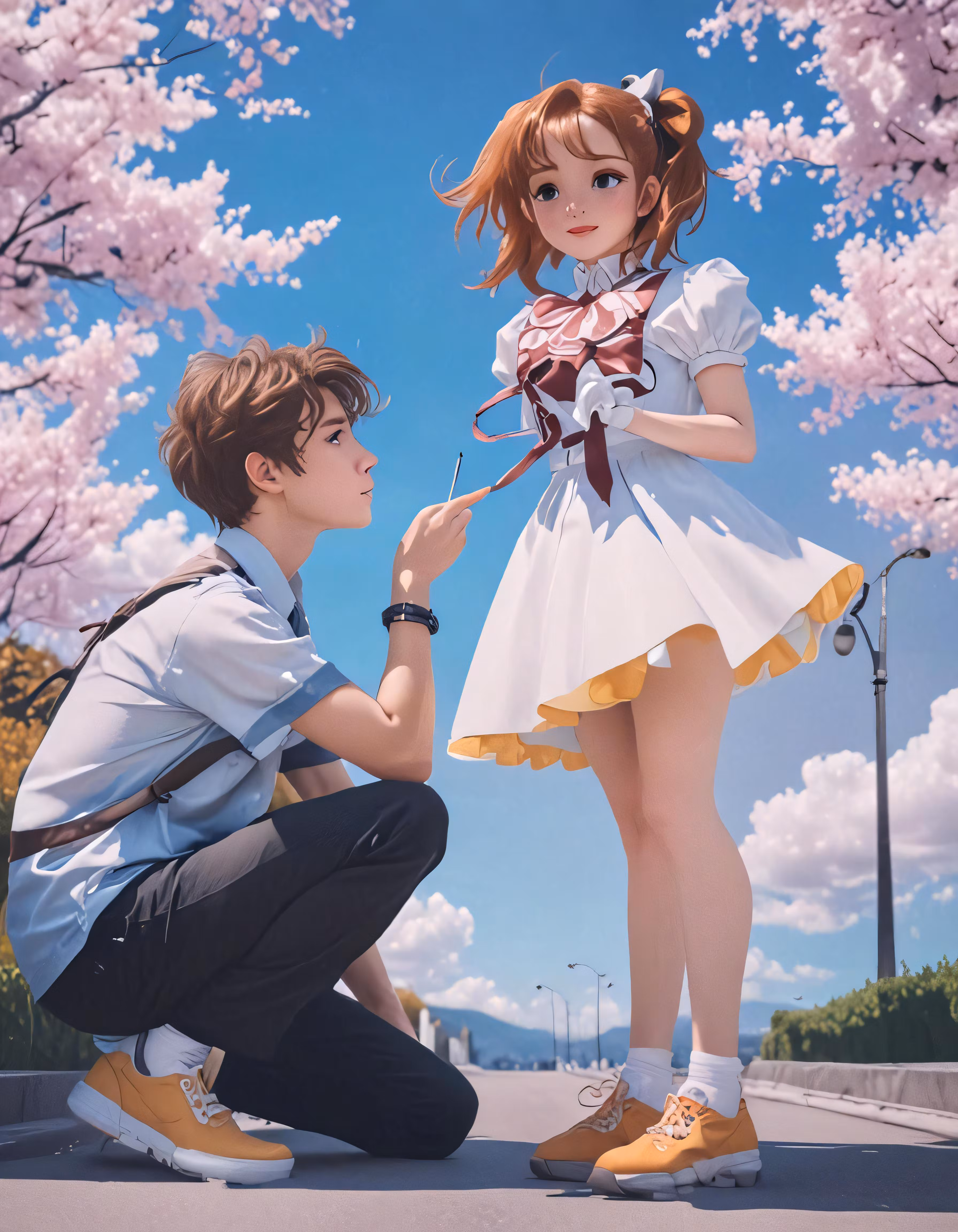 High resolution picture, free to use, an animated anime character kneeling on the ground next to a girl