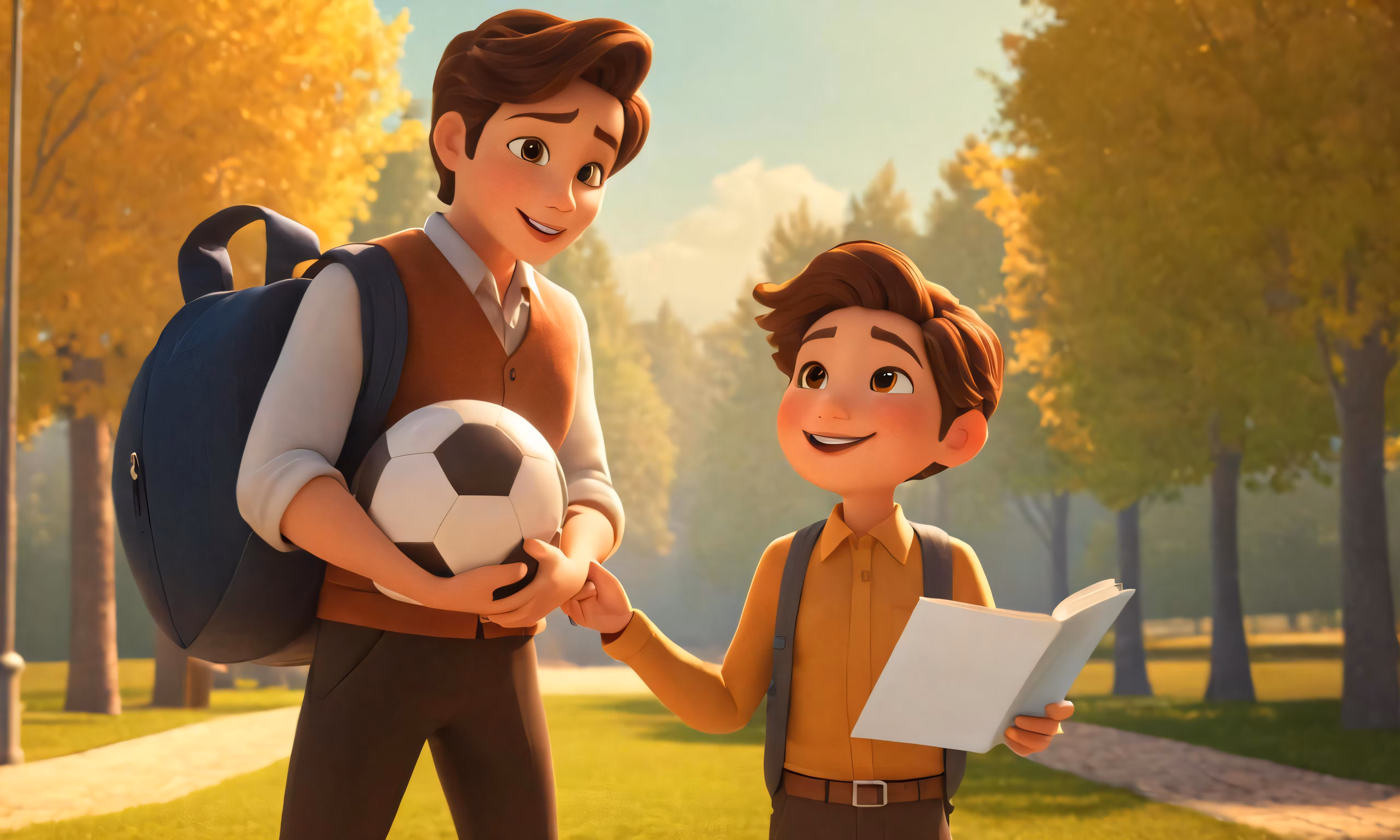 High resolution picture, free to use, an animated character holding a book and a soccer ball