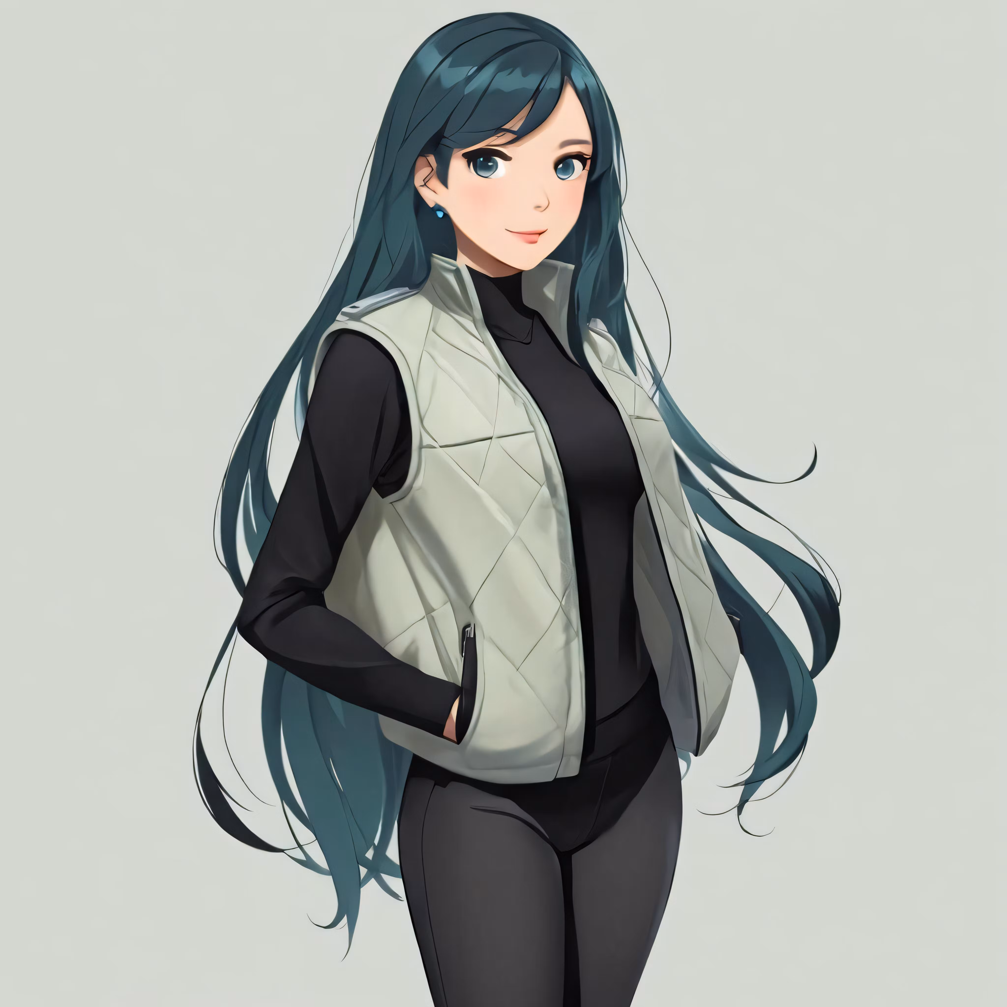 High resolution picture, free to use, an animated character with long, wavy blue hair in black clothes