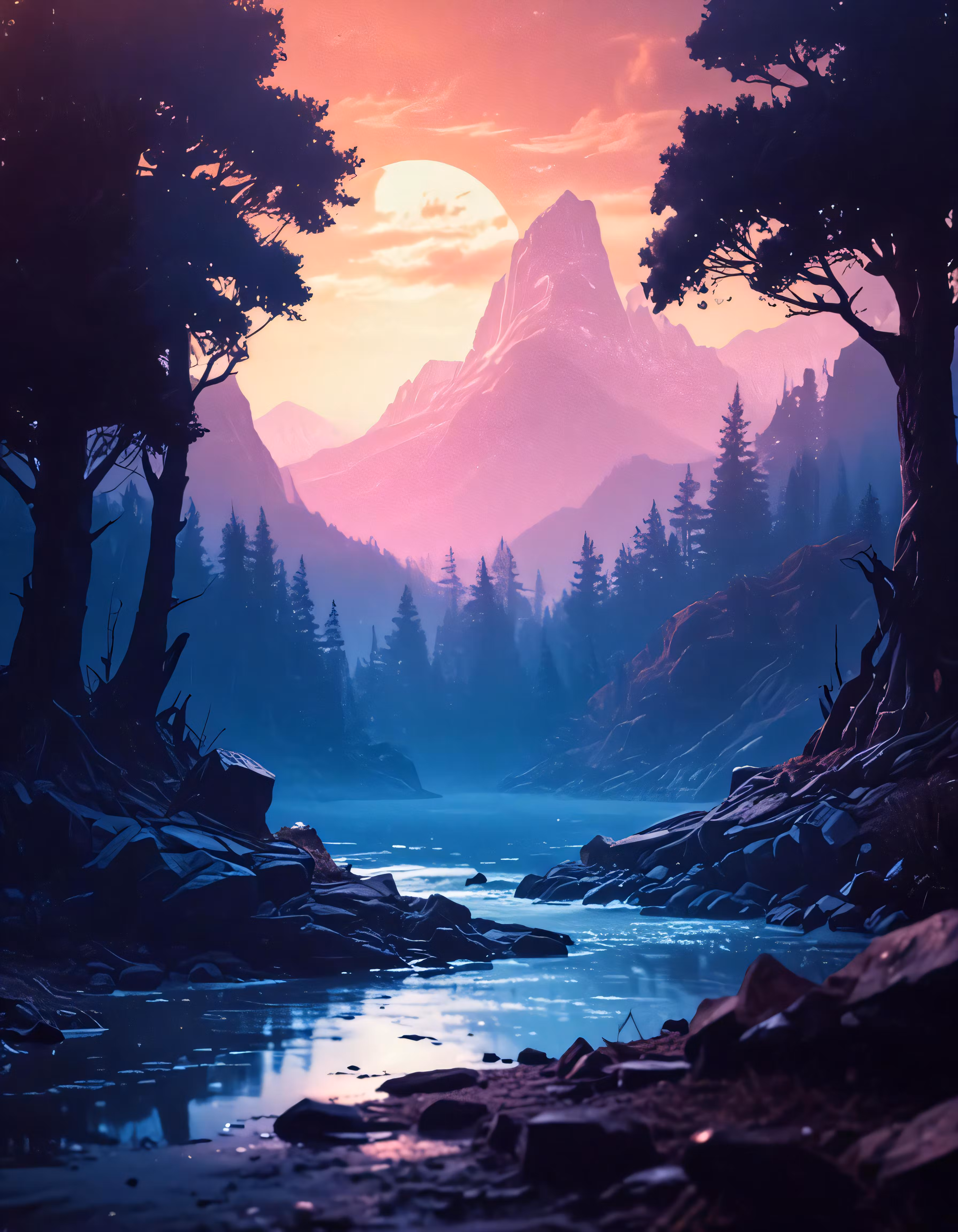 High resolution picture, free to use, an animated painting with a mountain and forest on it