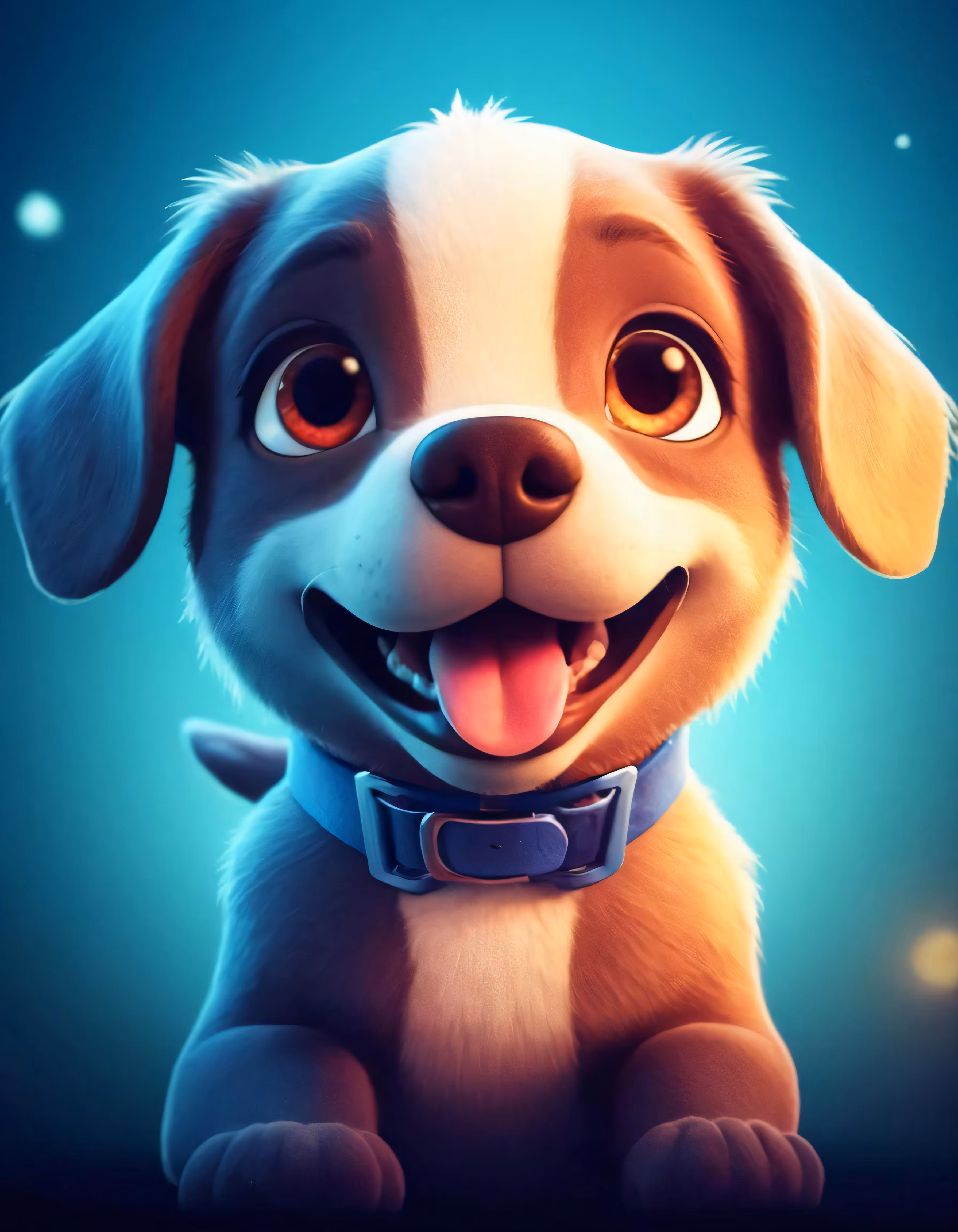 High resolution picture, free to use, an animated puppy dog is sitting and smiling