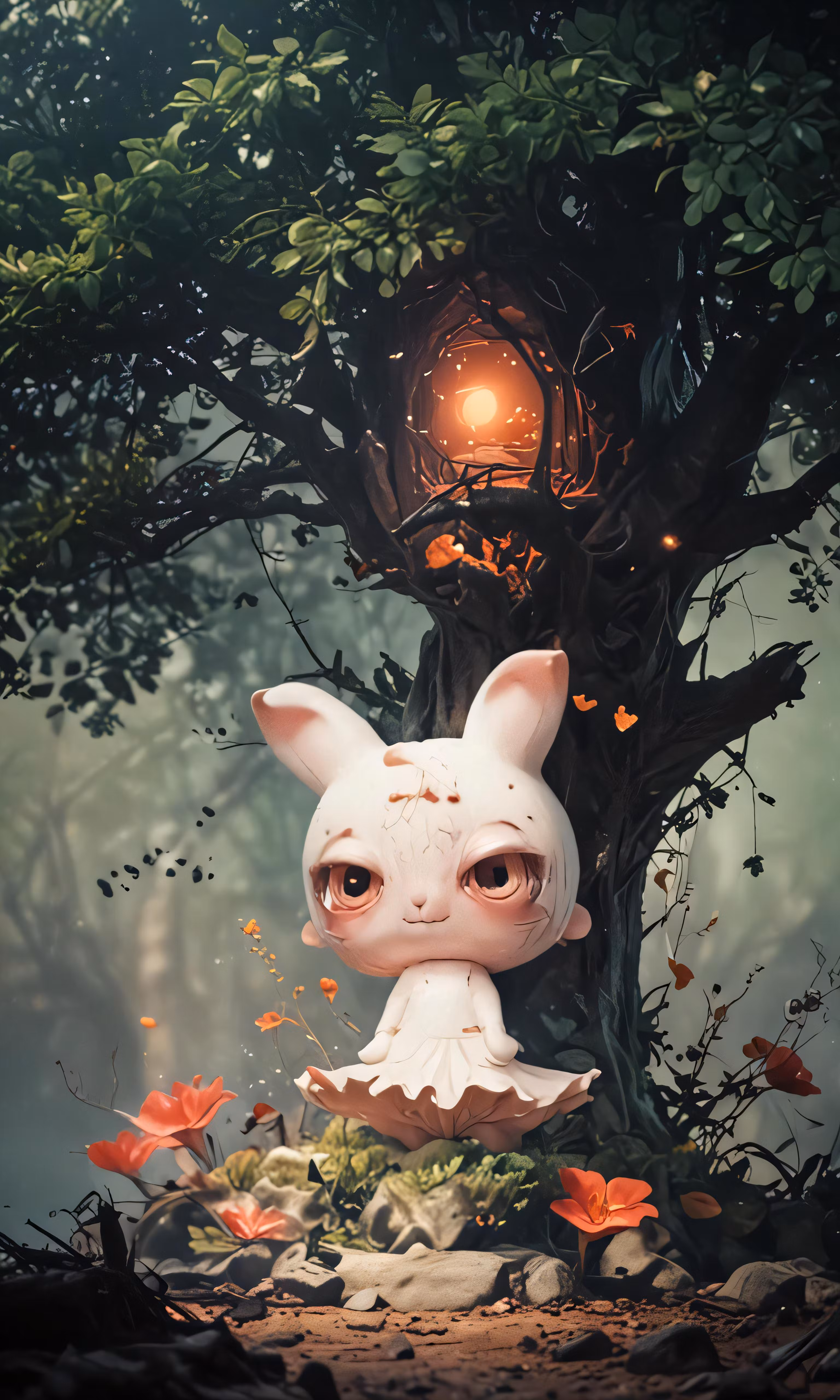 High resolution picture, free to use, an animated rabbit sitting under a tree with the light behind it