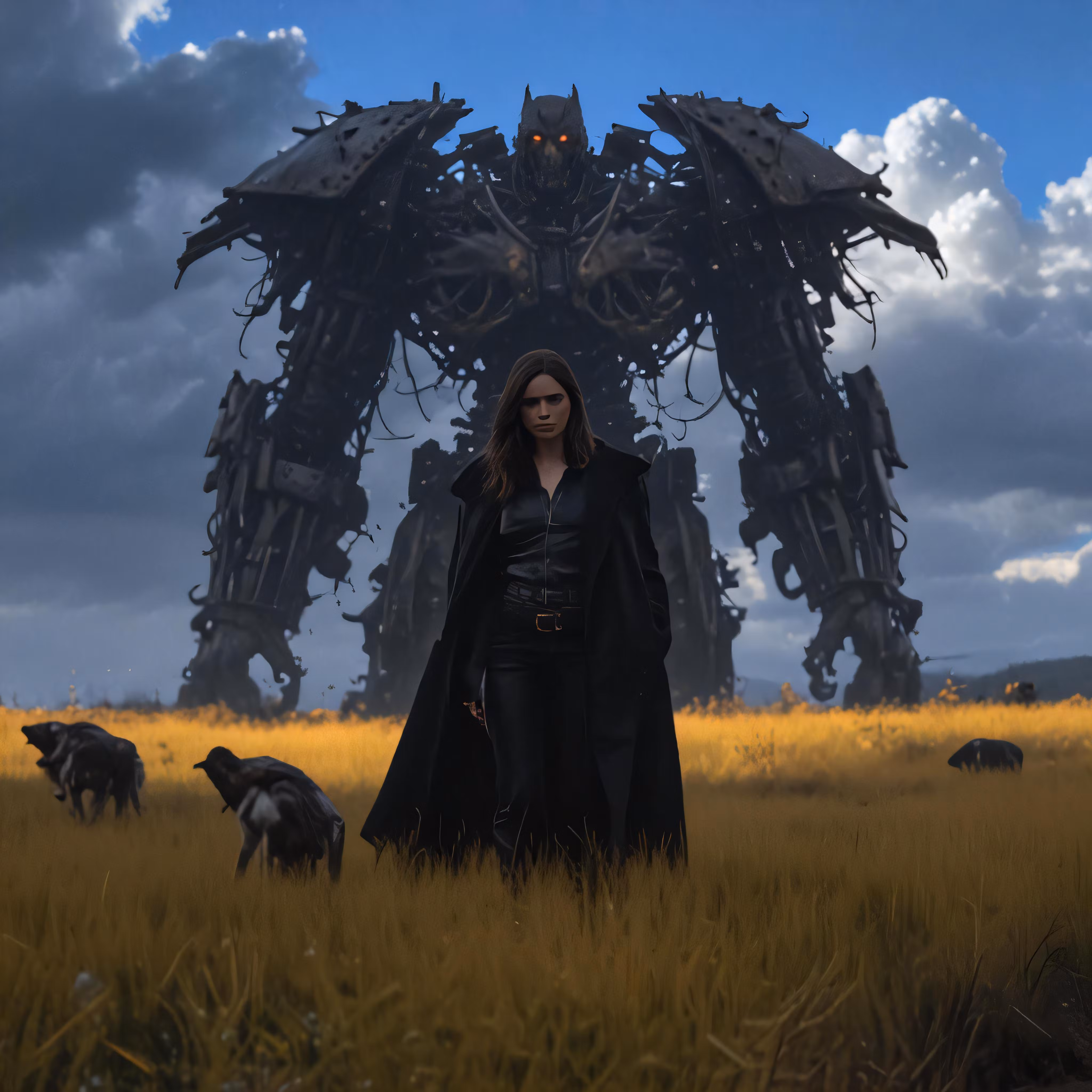 High resolution picture, free to use, an animated scene featuring a giant robot with many cows in the background