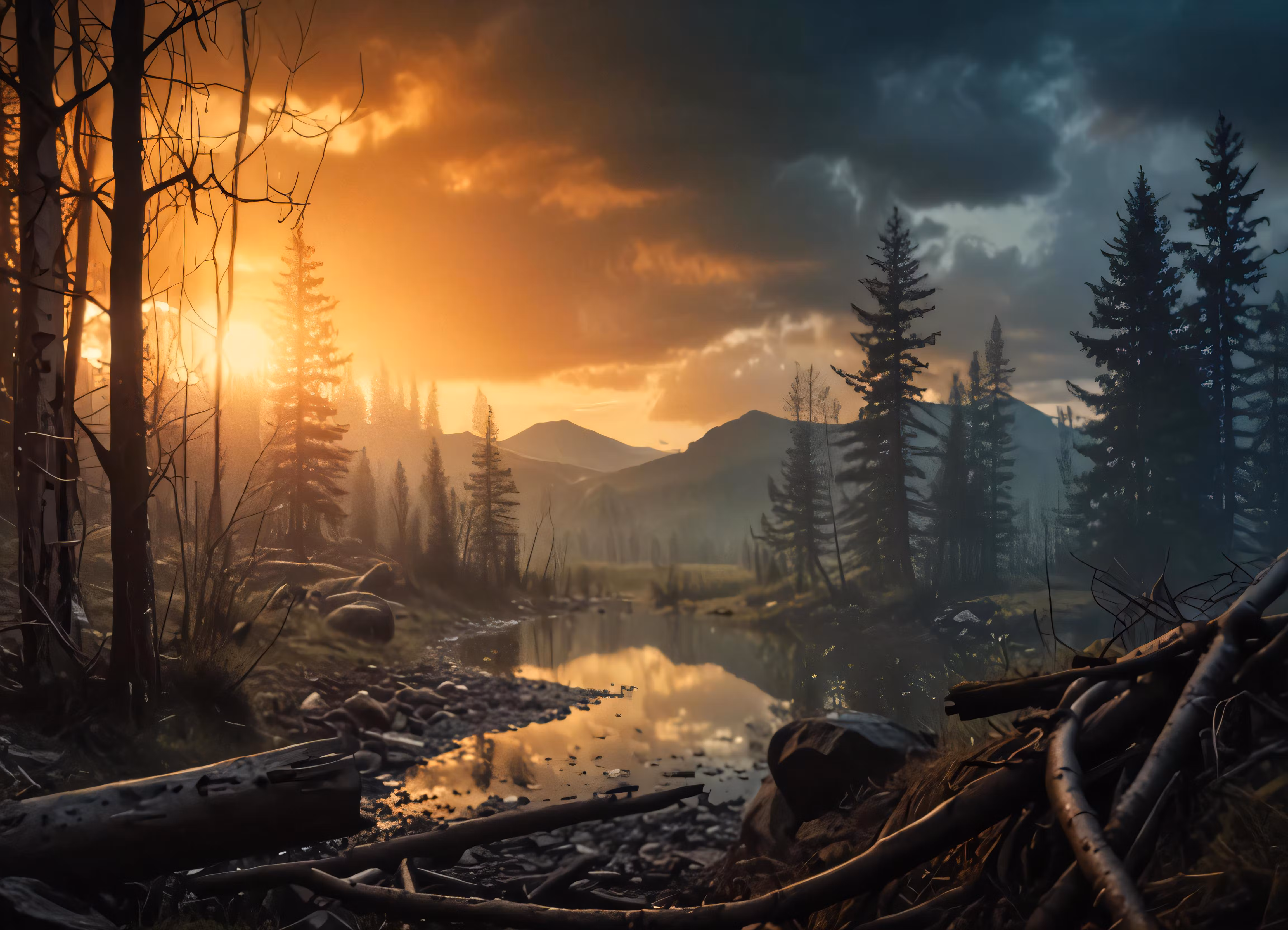 High resolution picture, free to use, an animated scene with sunset in the distance