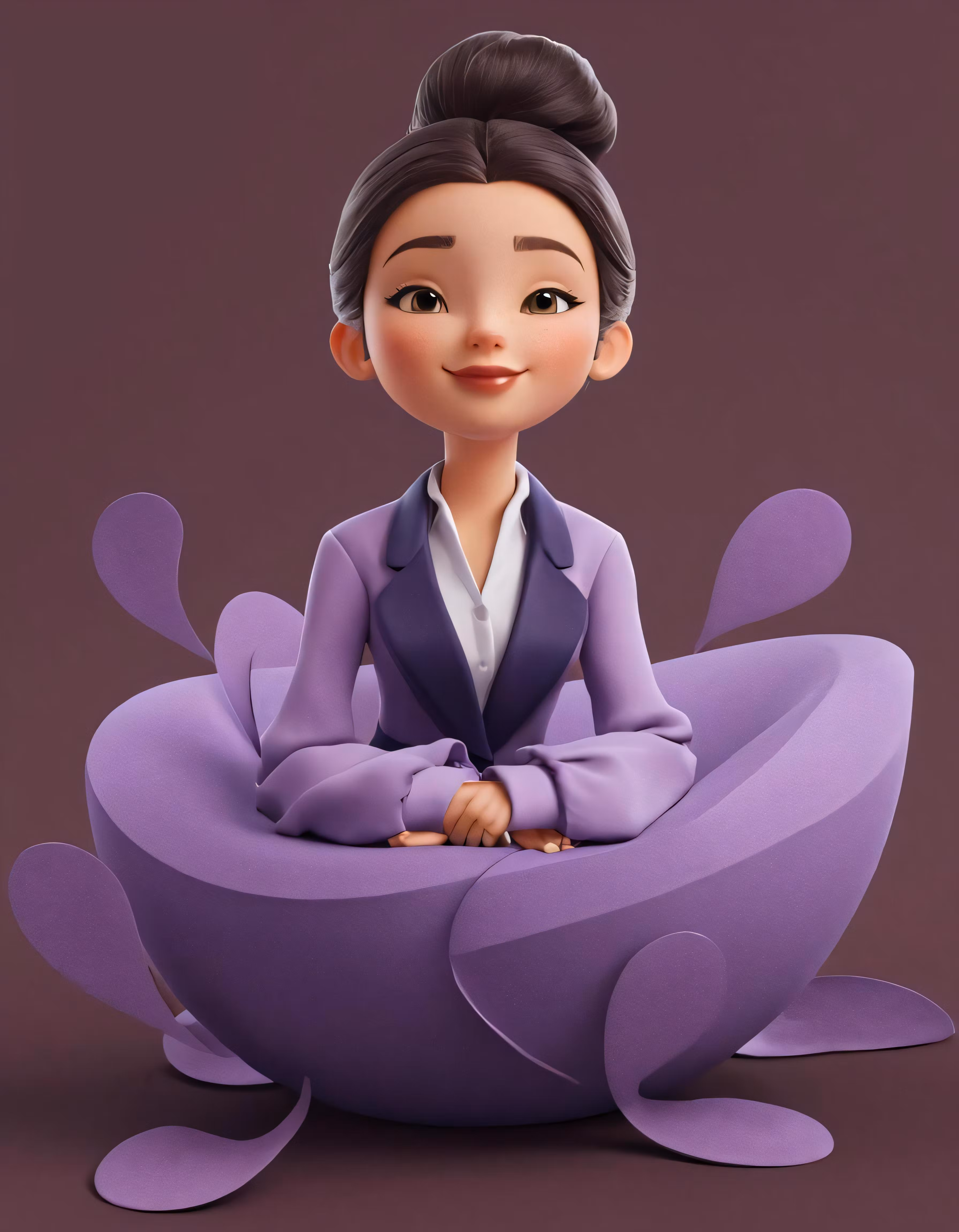 High resolution picture, free to use, an animated woman in purple with her arms folded, wearing a suit