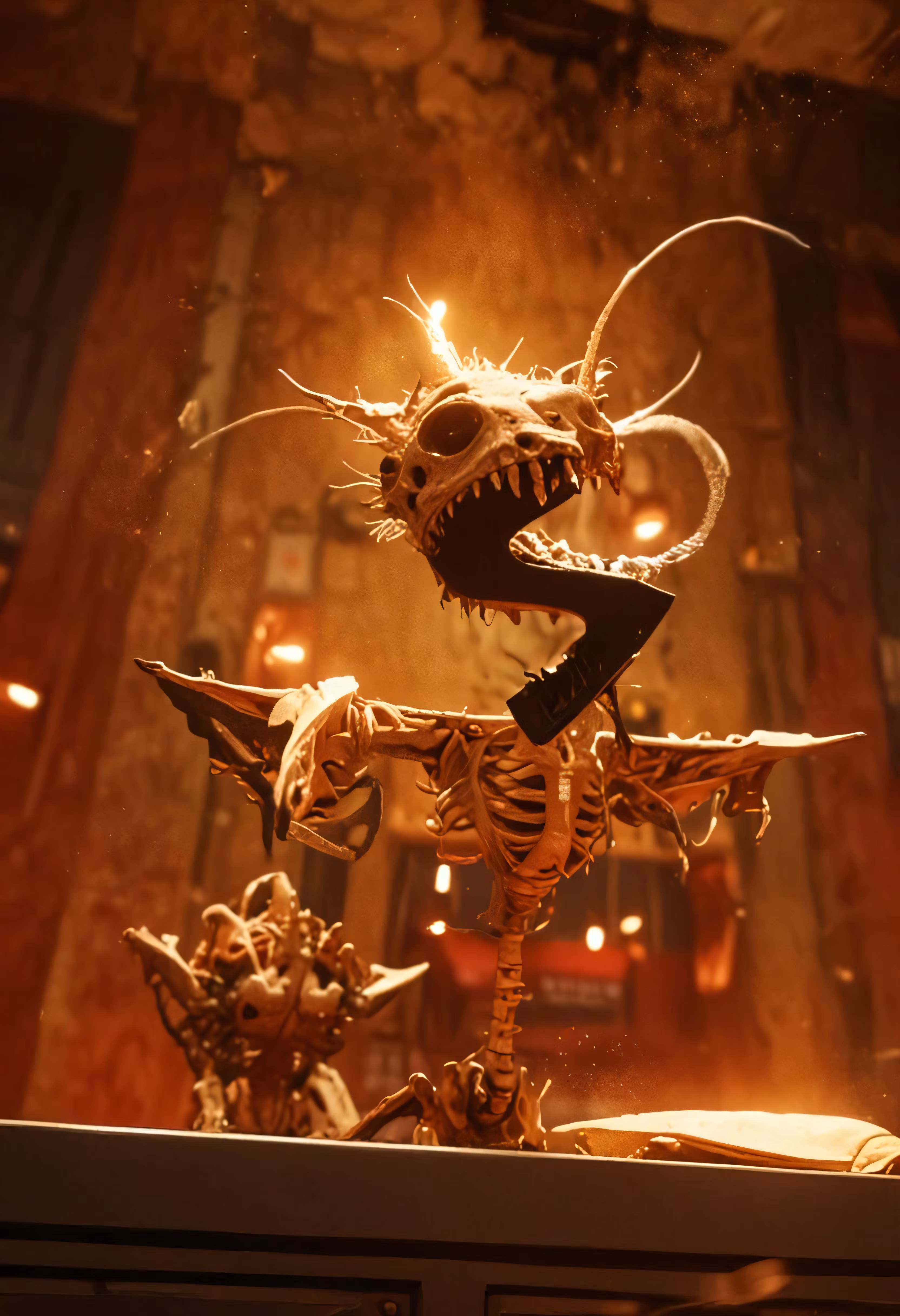 High resolution picture, free to use, an animation image of a skeleton alien walking through a room