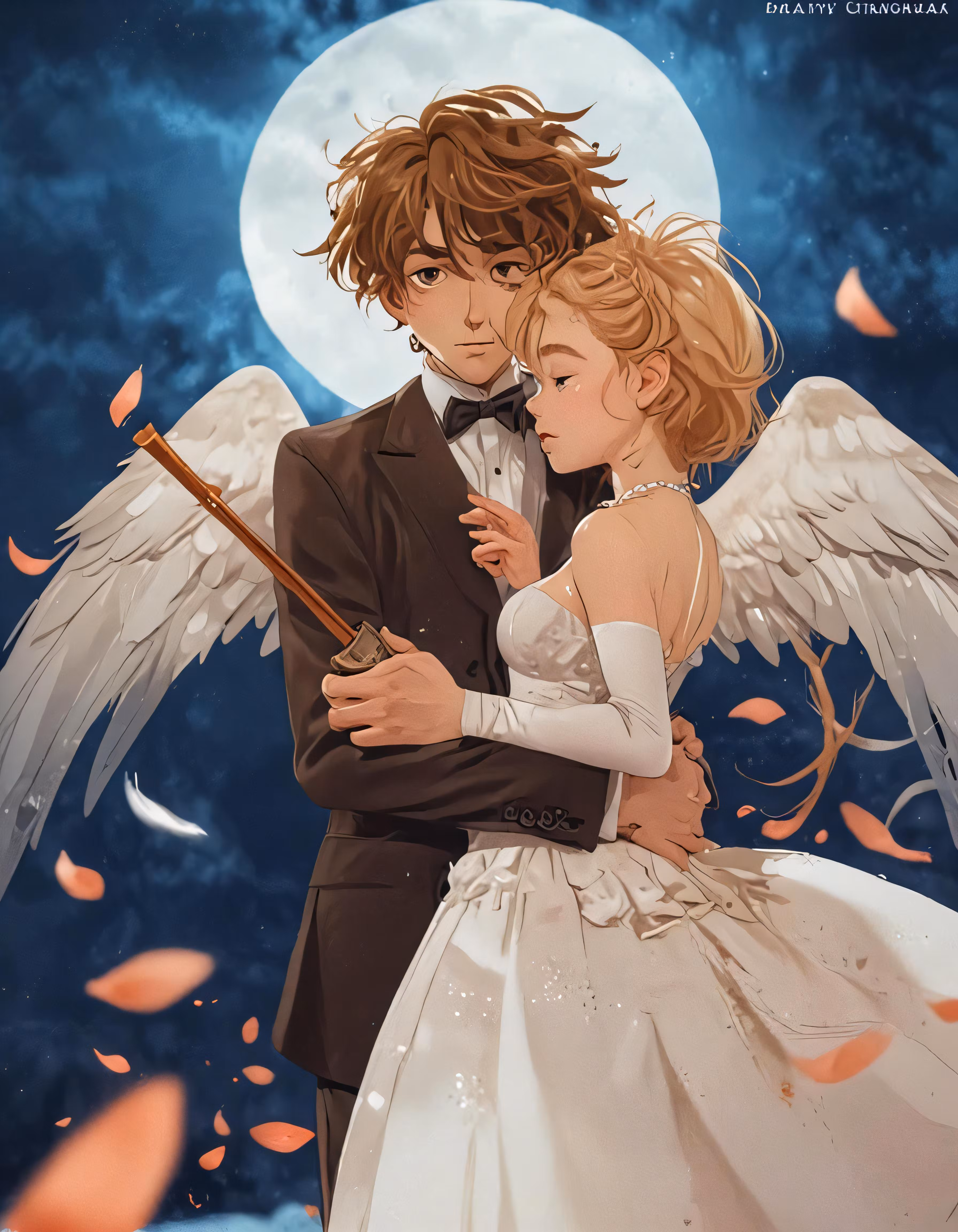 High resolution picture, free to use, an anime character and his bride in a wedding dress standing under the moon