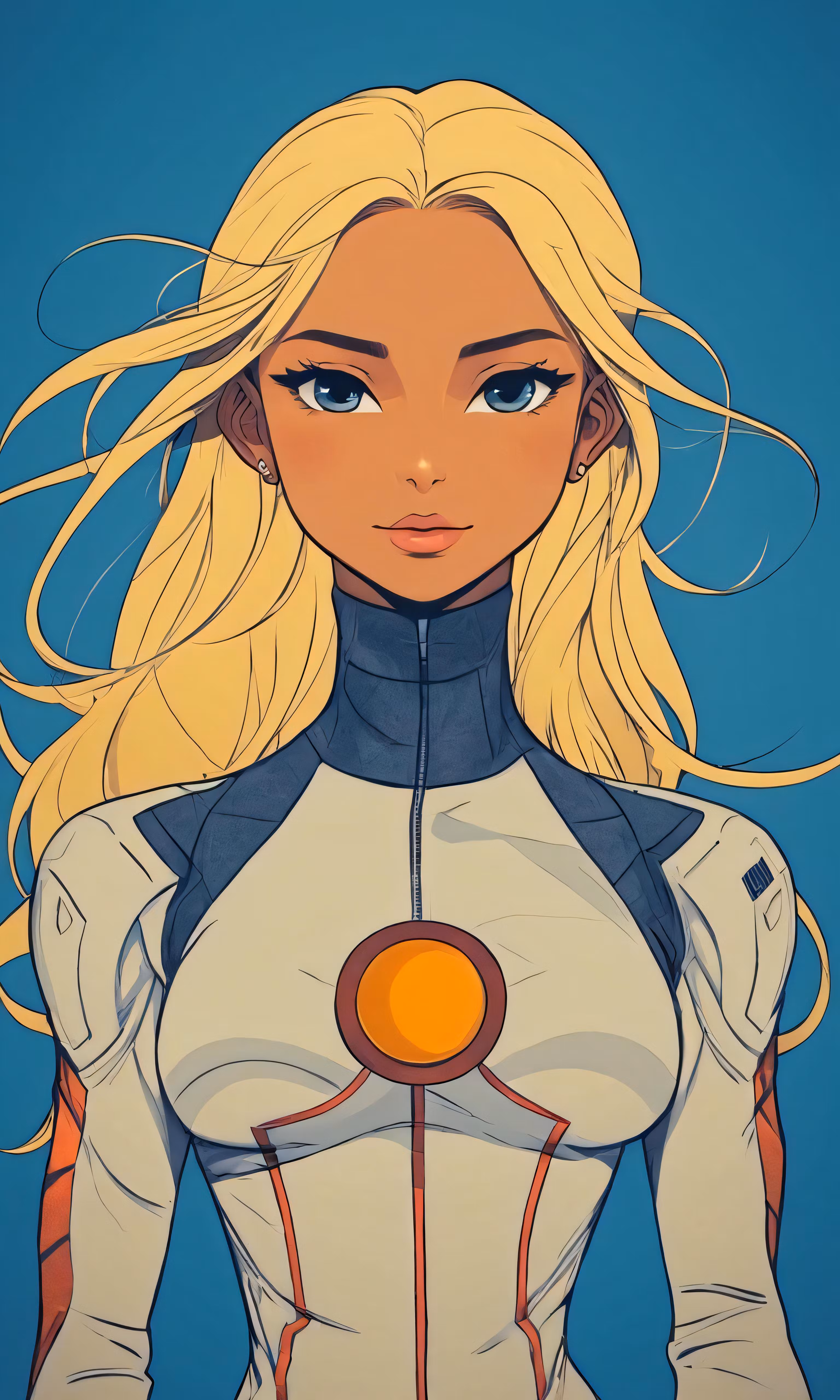 High resolution picture, free to use, an anime girl in white and orange holding her arms on a blue background