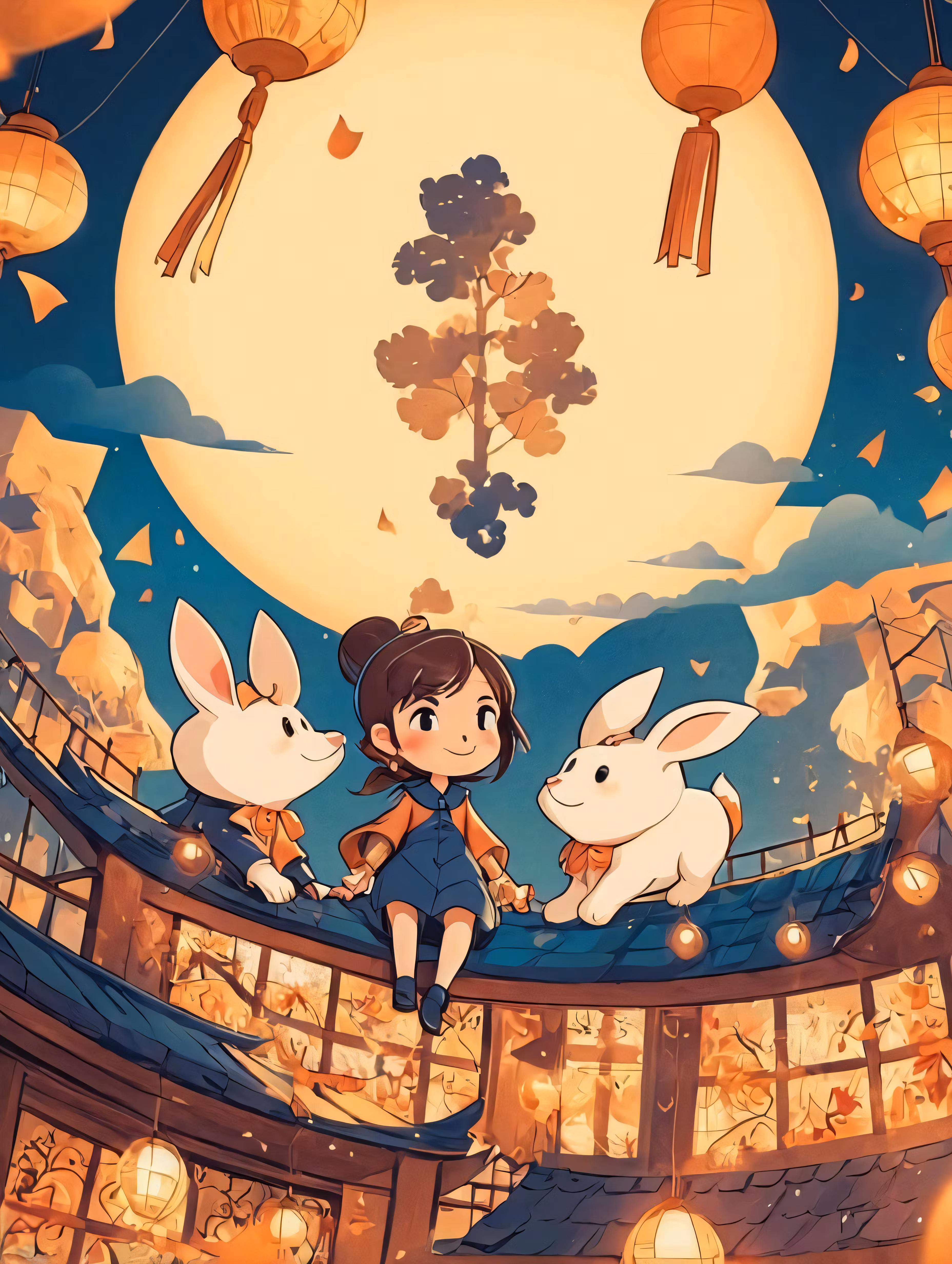 High resolution picture, free to use, an anime girl is sitting on top of the roof with two rabbits