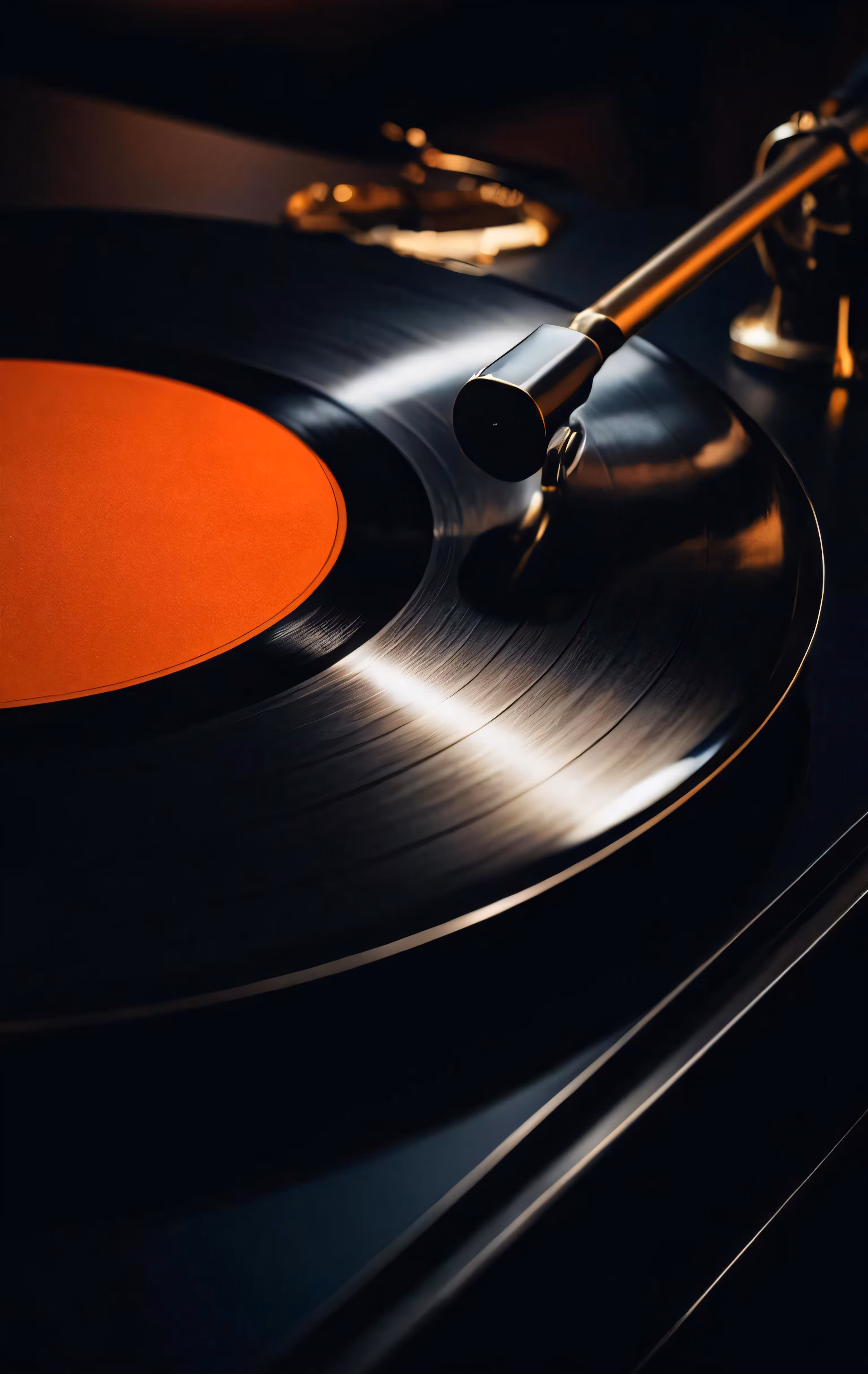 High resolution picture, free to use, an antique turntable with orange disc in a black room