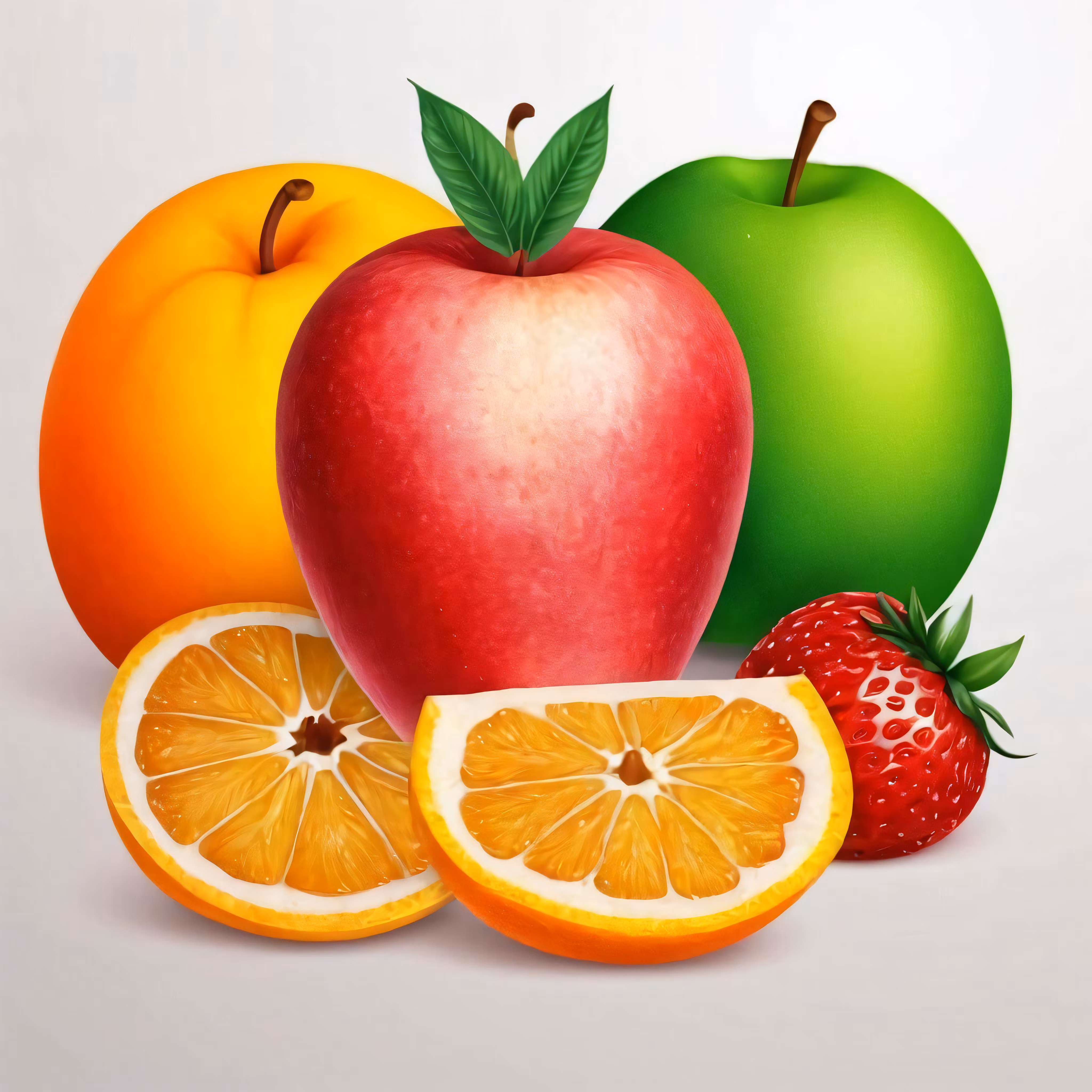 High resolution picture, free to use, an apple, orange and strawberry with one cut in half