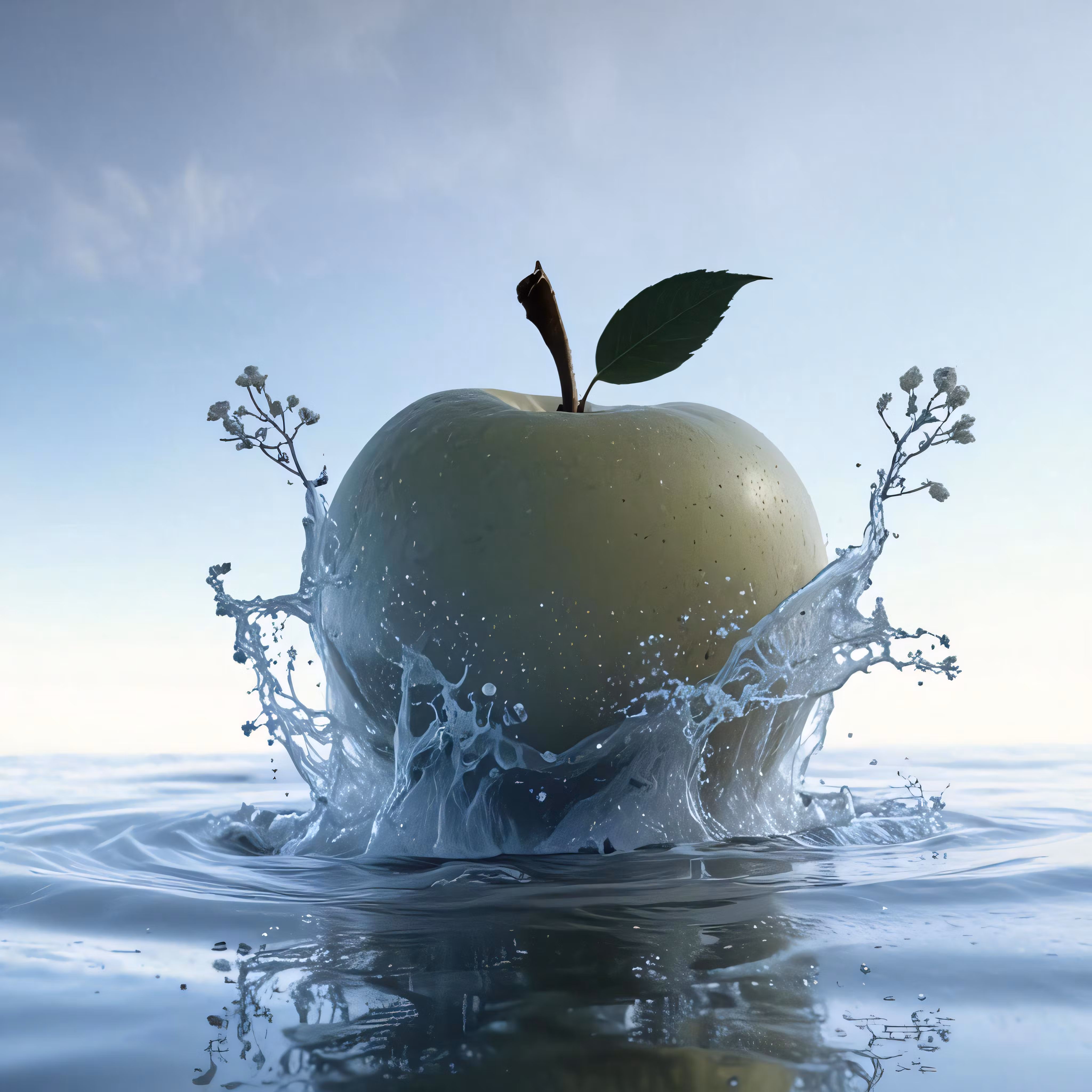 High resolution picture, free to use, an apple is floating in water with water splashing from it