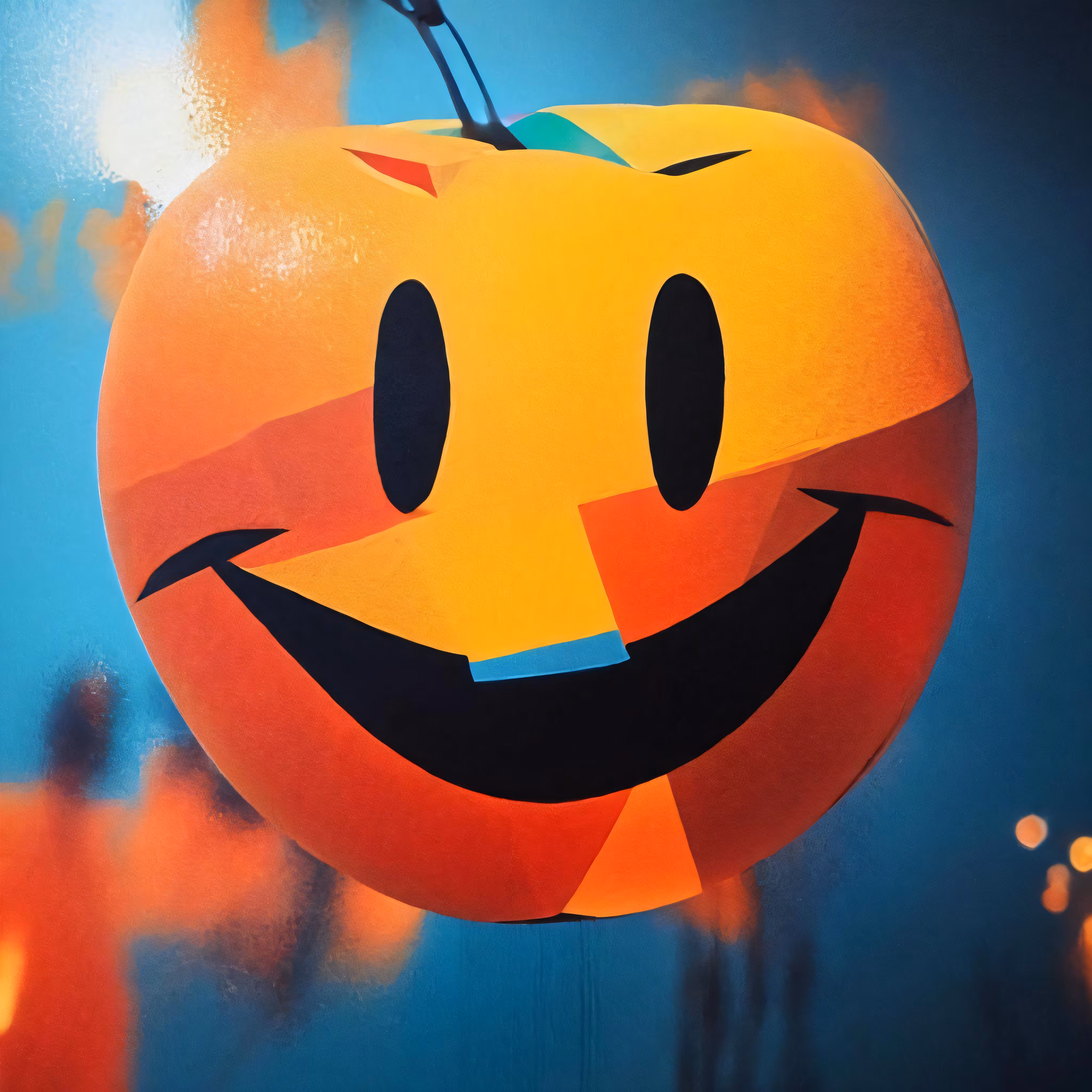 High resolution picture, free to use, an apple shaped like a smiling pumpkin on display