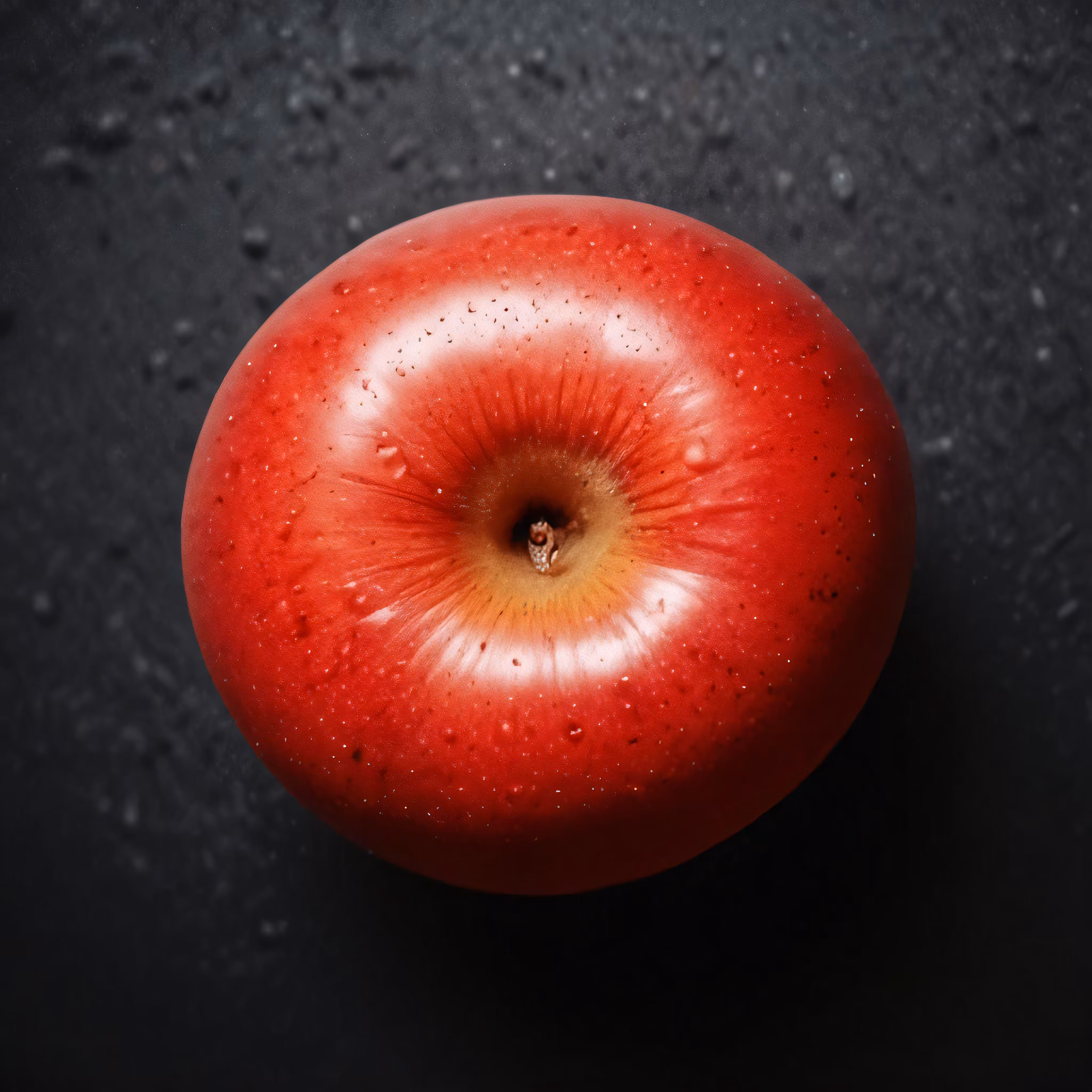 High resolution picture, free to use, an apple sits on a black surface while drops of water are covering it
