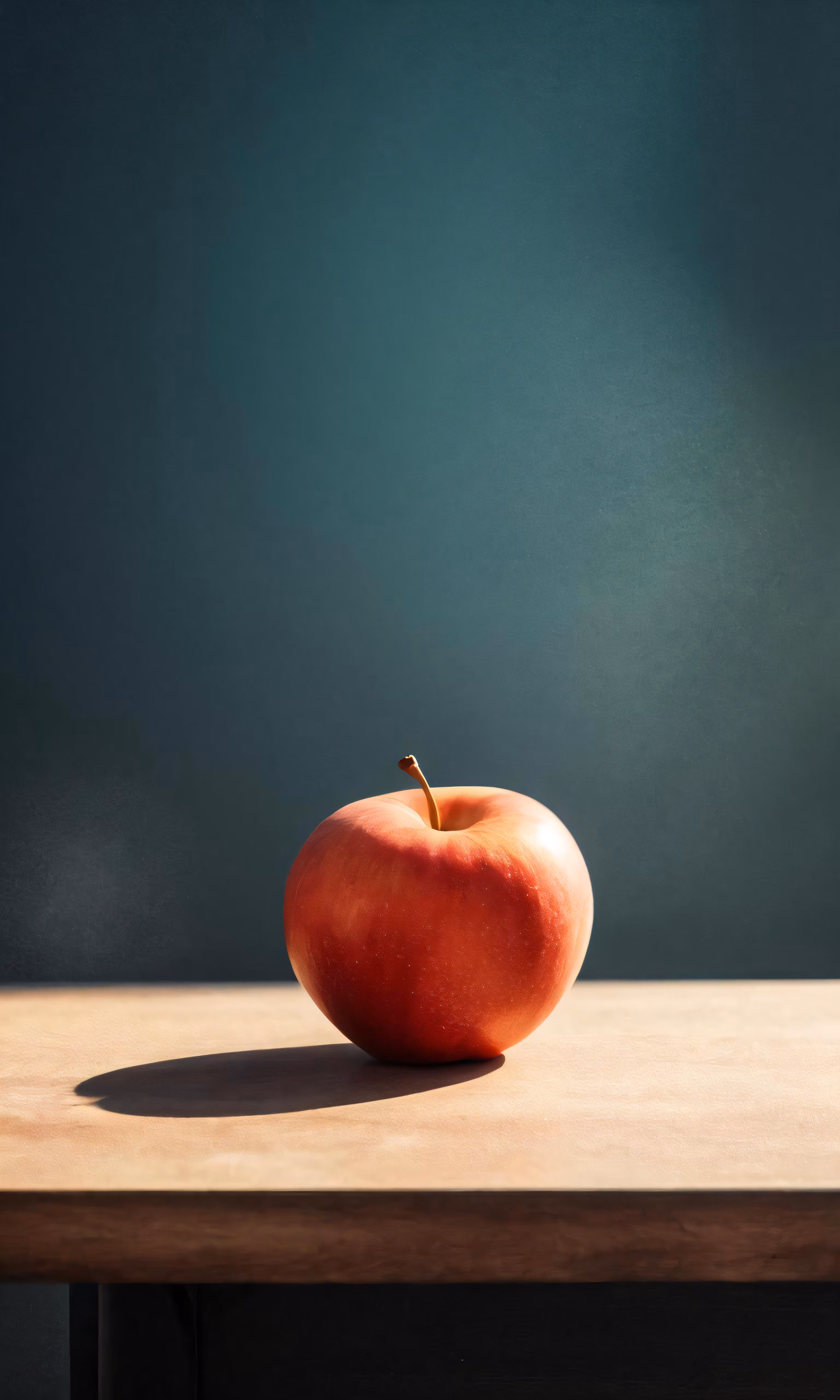 High resolution picture, free to use, an apple sits on the table top against a green wall
