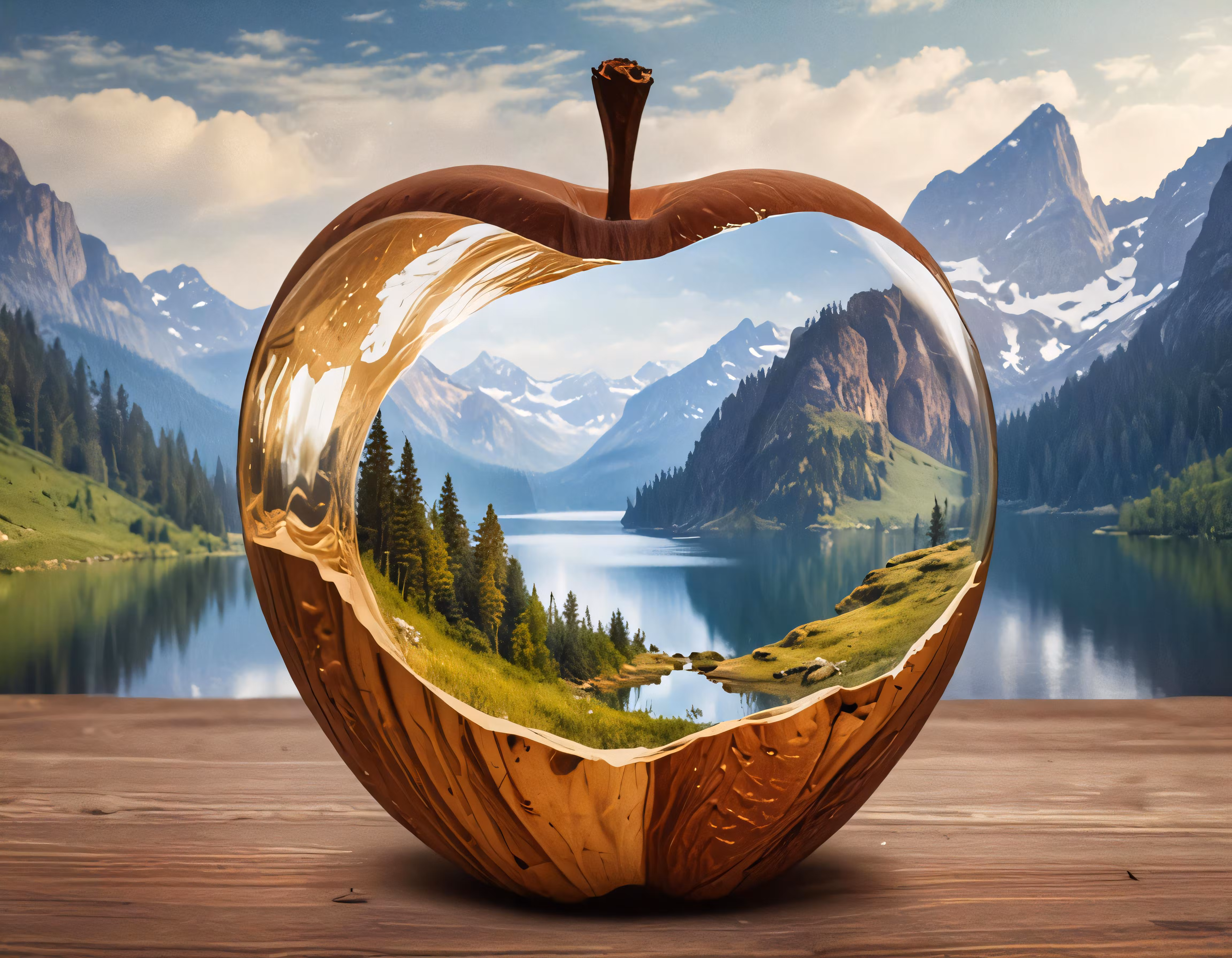 High resolution picture, free to use, an apple statue in front of a mountain landscape