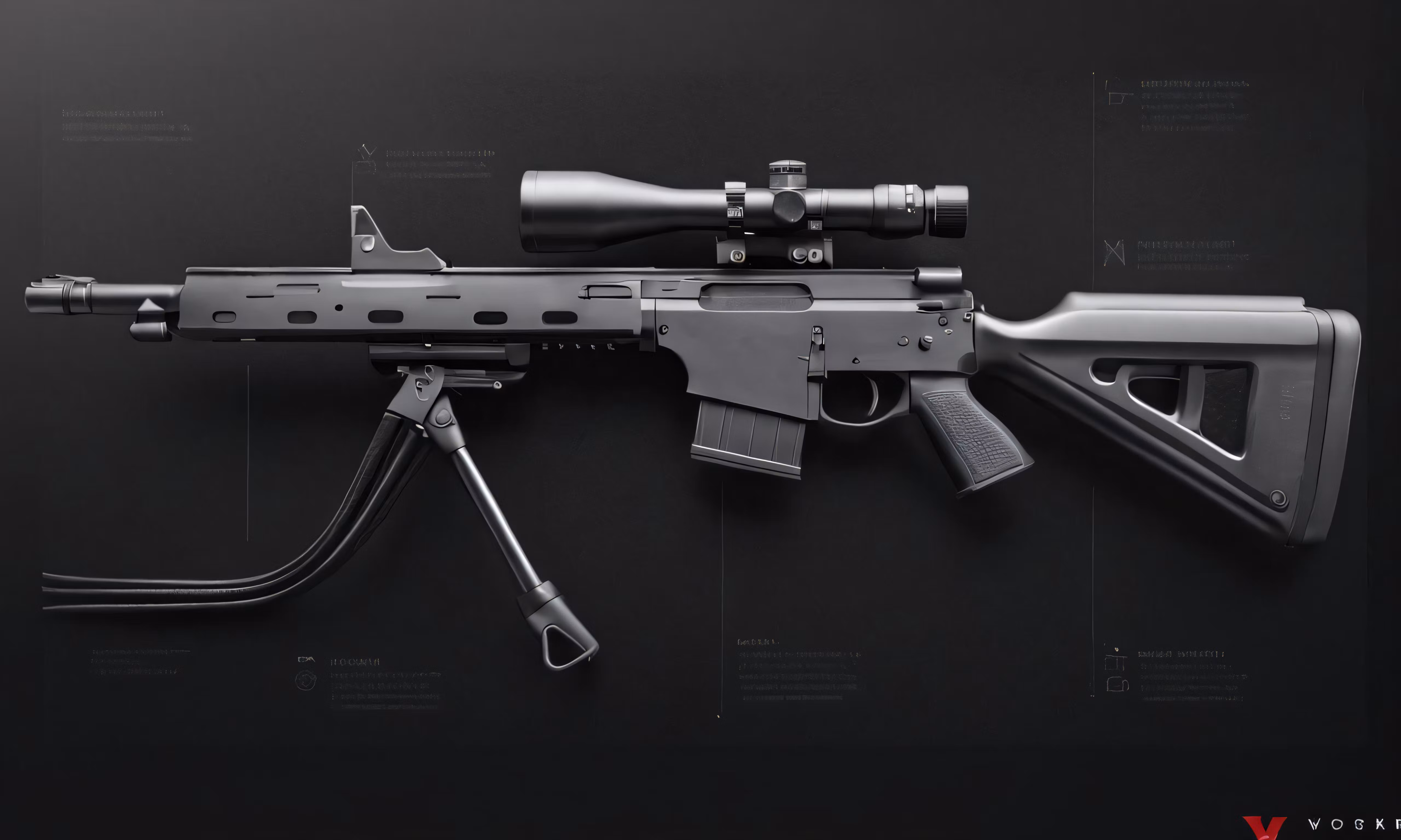 High resolution picture, free to use, an ar   15 rifle on display with scopes, lightening and a gun