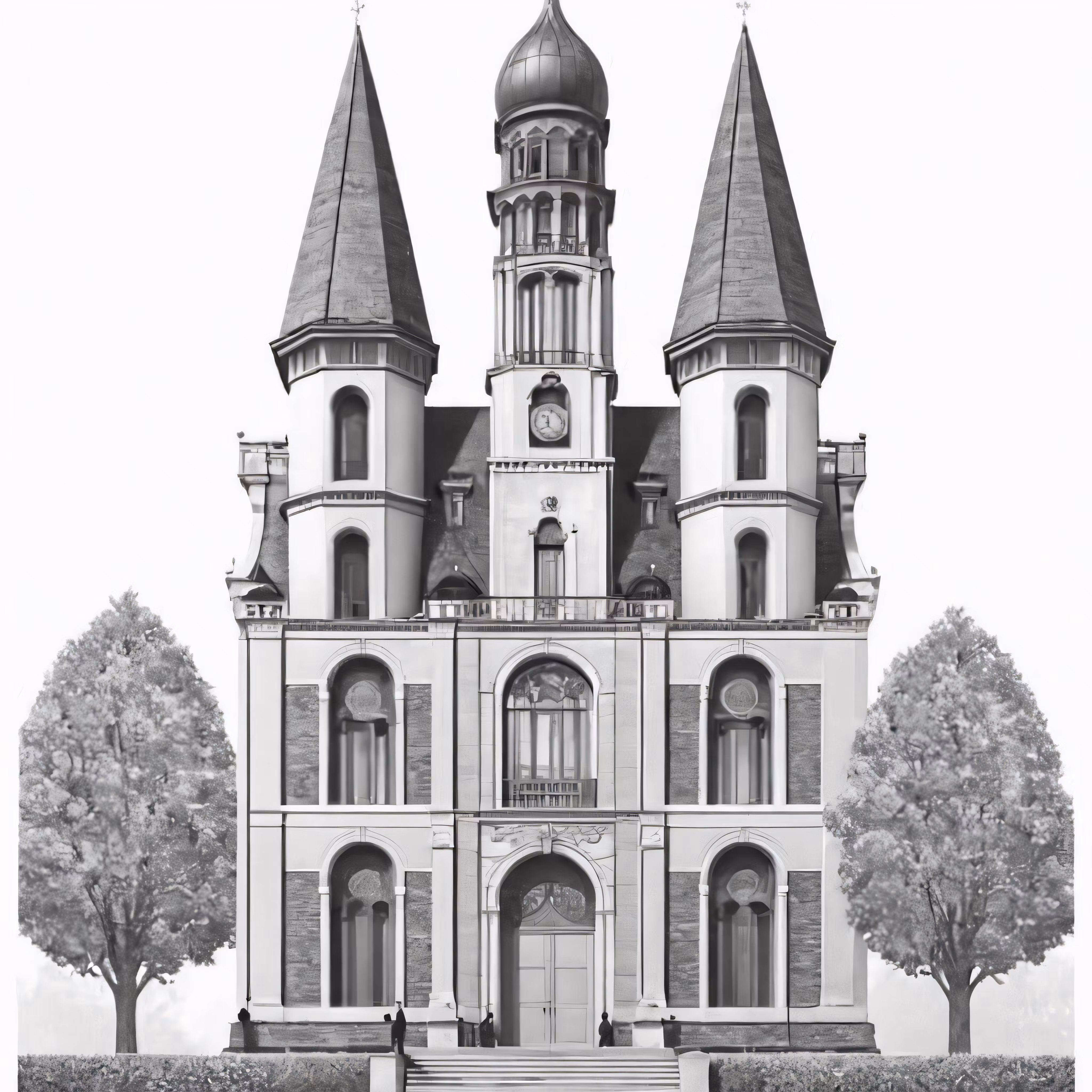 High resolution picture, free to use, an architectural drawing of a church with turrets and stairs