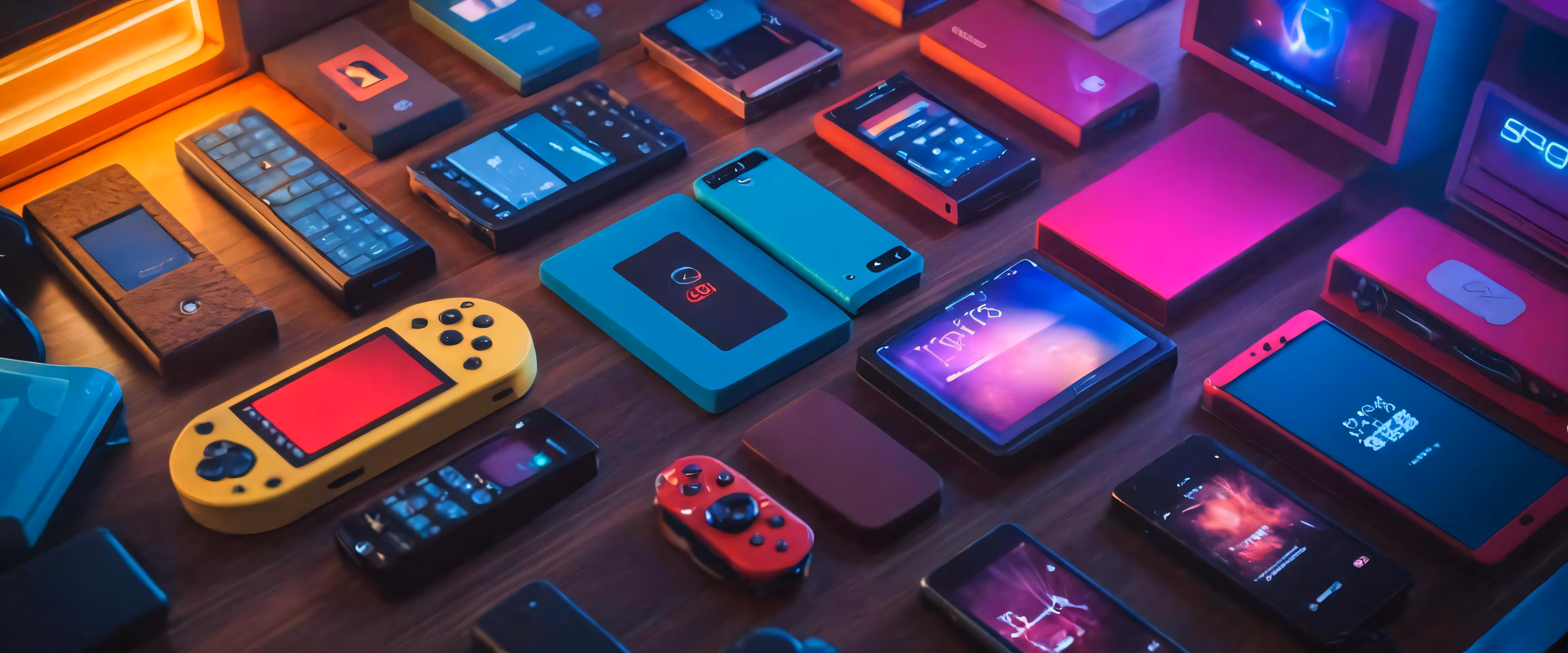 High resolution picture, free to use, an array of mobile devices lined up on a wooden surface