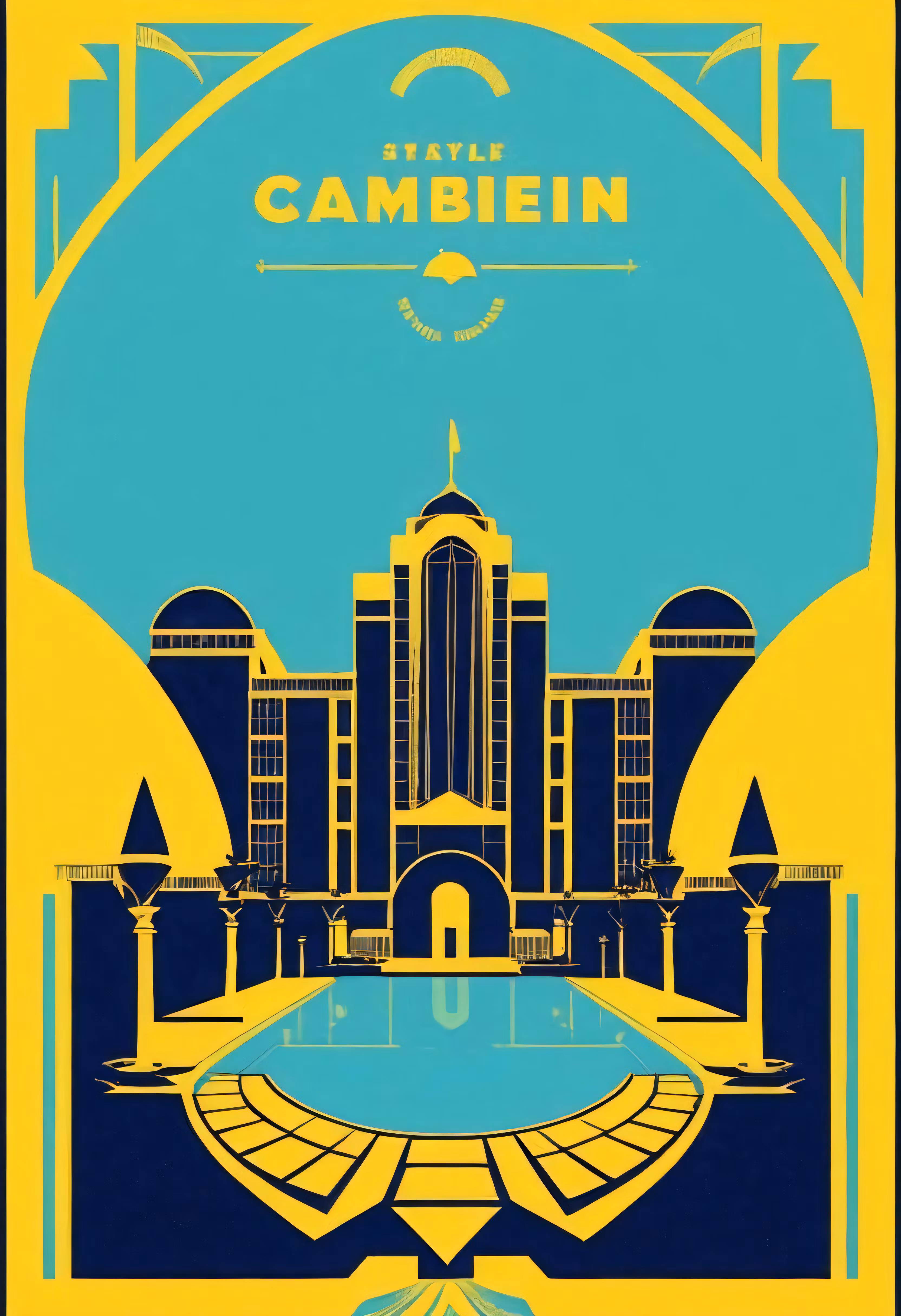 High resolution picture, free to use, an art deco poster with a building on the outside