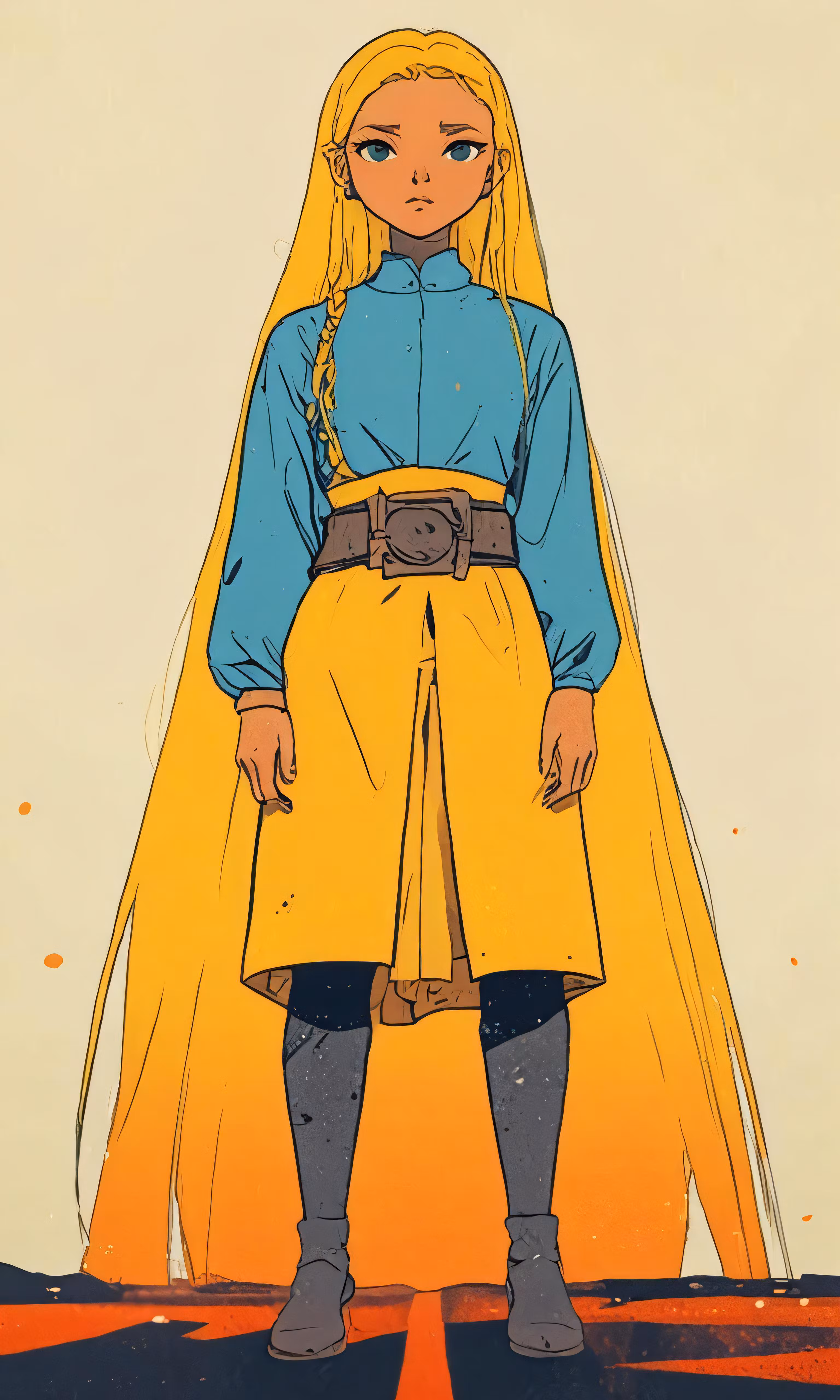 High resolution picture, free to use, an art piece depicting a young blonde girl wearing a blue top, a skirt, and yellow boots