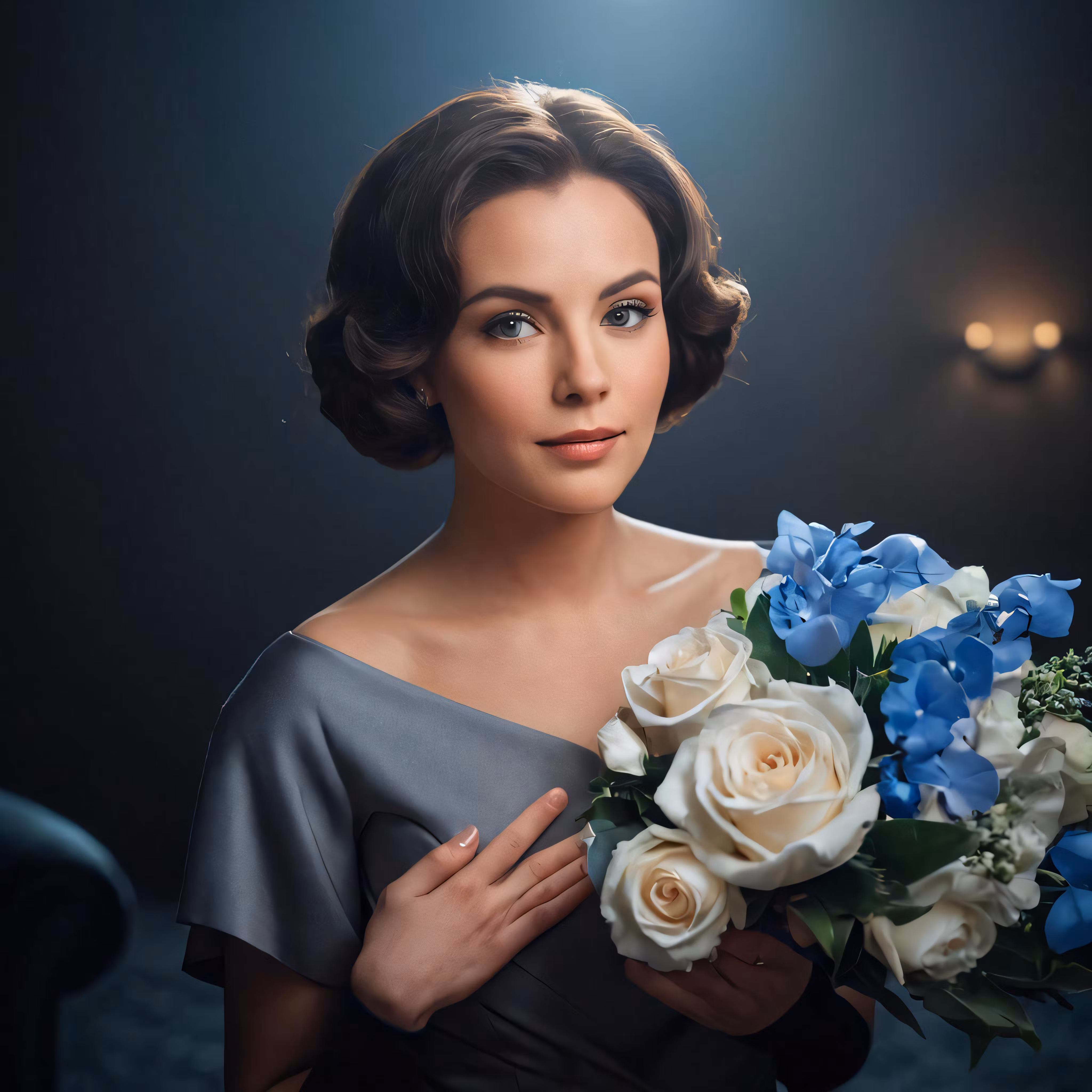 High resolution picture, free to use, an art print depicting the face of a woman in grey dress holding flowers