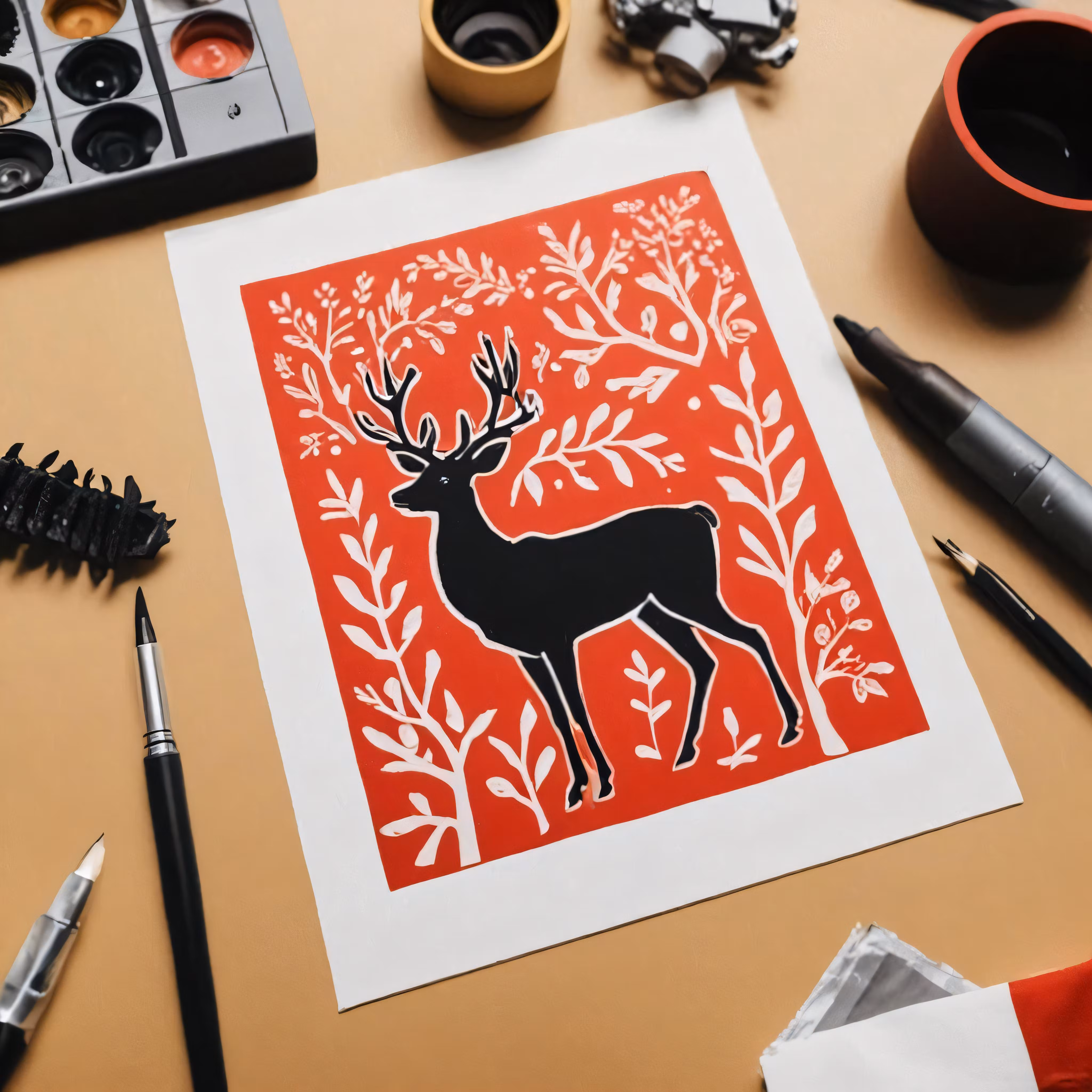 High resolution picture, free to use, an art project featuring a red   glazed picture of a stag, surrounded by ink and color pens